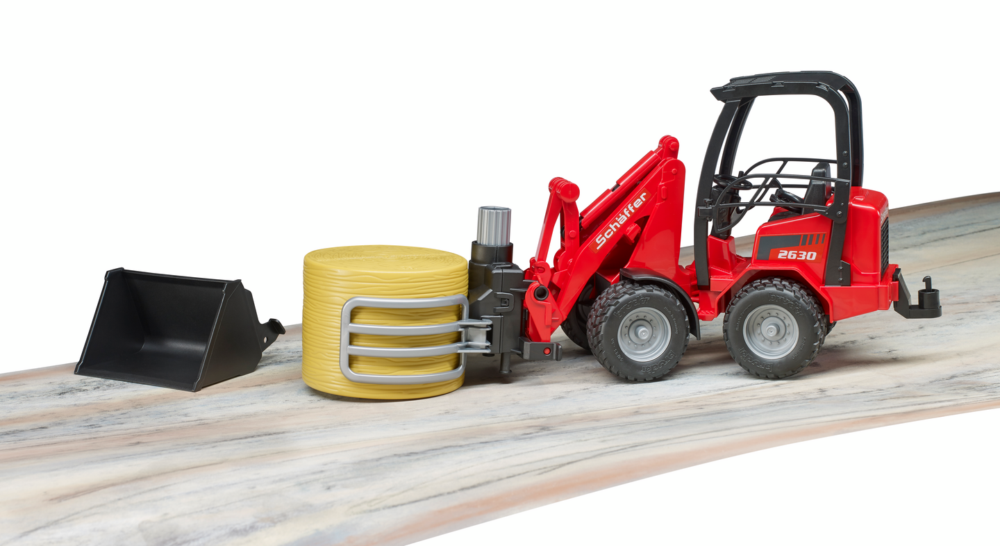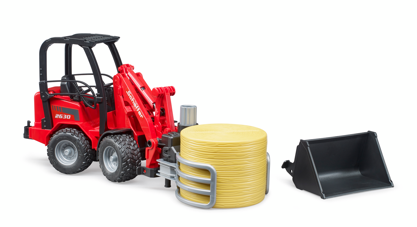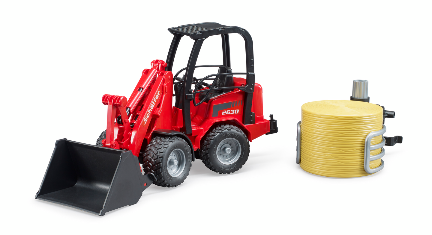 Bruder Schäffer Compact loader 2630 paalipihdeillä ja 1 pyöröpaali lelu