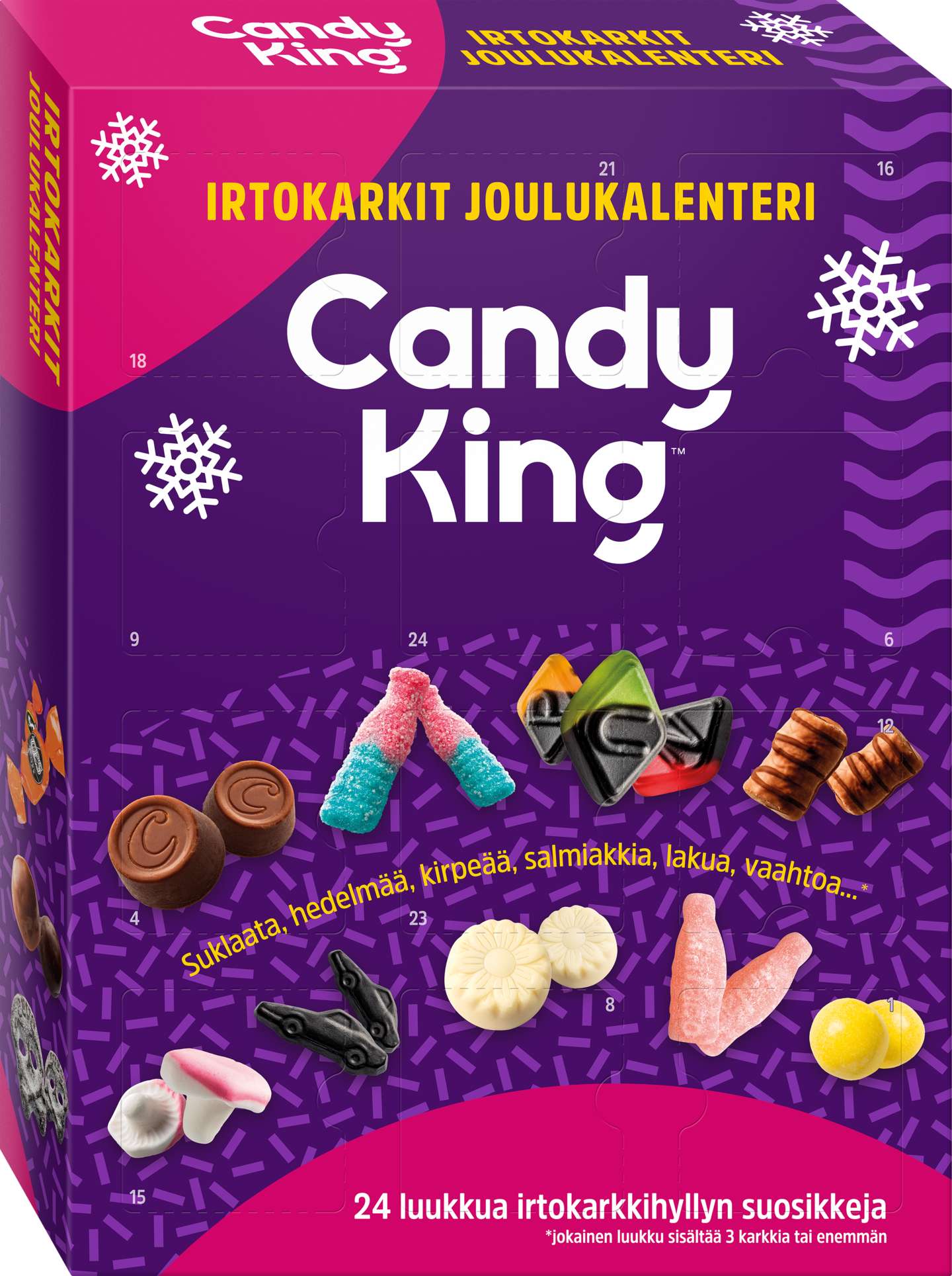 CandyKing Irtokarkit joulukalenterissa on 24 luukkua irtokarkkihyllyn herkullisimpia suosikkeja joulunodotukseen. Kalenterissa puolet luukuista sisältää suklaisia makeisia. Lisäksi luukuista paljastuu herkullisia hedelmäkarkkeja, sopivan kirpeitä karkkeja, salmiakkia, lakritsia ja pehmeitä vaahtokarkkeja. Joulunodotuksen herkutteluhetken voi jakaa perheenjäsenen kanssa, sillä jokainen luukku sisältää useampia makeisia. Yhdessä luukussa on koosta riippuen makeisia kolmesta kappaleesta ylöspäin. Kalenterin mitat ovat: leveys 32 cm, korkeus 43 cm, syvyys 8 cm ja kalenteri painaa 600 grammaa.