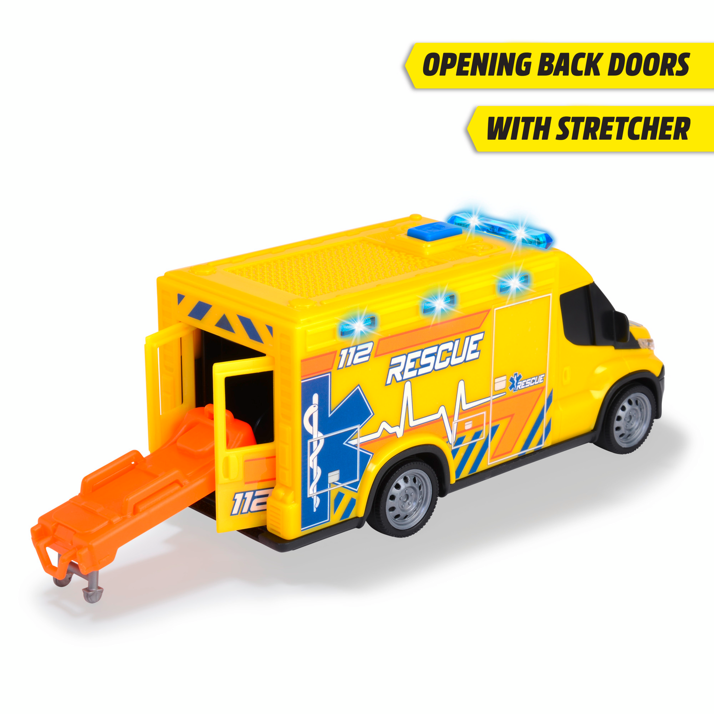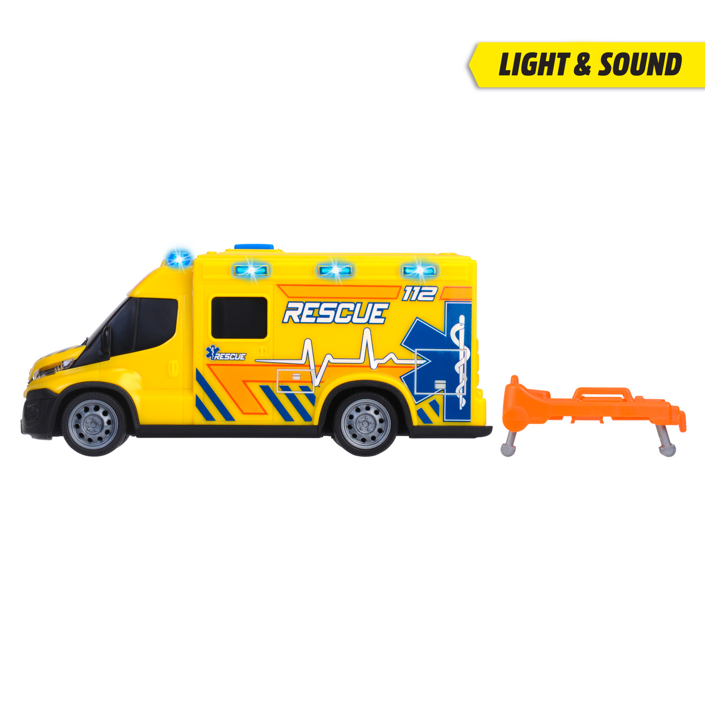 Iveco Daily ambulanssi tuleville pelastustyöntekijöille! Ambulanssi on varustettu ääni- ja valotehosteilla, ja takaovista saa otettua paarit ulos auttamaan pelastustehtävissä. Sisältää paristot. Ikäsuositus 3+.