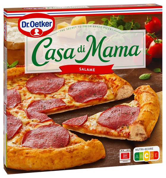 Casa di Mama Salame pizza, jossa on rapeaksi kohoavalla pohjalla täytteenä reilusti salamia sekä herkullista tomaattikastiketta, pakaste.