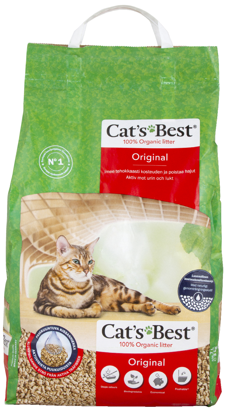 Cat’s Best® Original koostuu teknologisesti jalostetuista puukuiduista. Uuden ICS* WOOD FIBRE TECHNOLOGY -tekniikan avulla valmistetut aktiiviset puukuidut sitovat kosteuden ja hajuhaitat erittäin nopeasti ja pysyvästi – täysin luonnollisesti. Tämä pitää kissan hiekkalaatikon miellyttävän puhtaana pitkään, ilman koko laatikon sisällön vaihtamista. Cat’s Best® Original on kevyempää ja imuteholtaan kolme kertaa tehokkaampaa kuin tavallinen kissanhiekka, mikä helpottaa kissan hiekkalaatikon hygieniasta huolehtimista. Toisin sanoen: vähemmän työtä ja vähemmän vaivaa, sillä hiekka on niin kevyttä, että sen kuljettaminen ja kissan hiekkalaatikon puhdistaminen käy kuin itsestään! Yksittäiset paakut on helppo hävittää WC:n kautta (noudata paikallisia jätteen käsittelyohjeita). Luonnollisen pehmeää tassujen alla; valmistettu uusiutuvista, PEFC-sertifioiduista puuteollisuuden uusioraaka-aineista. Cat’s Best® on luonnontuote. Tuotteen väri ja muoto voivat vaihdella. Biologisesti hajoava. (*Intelligent Capillary System)