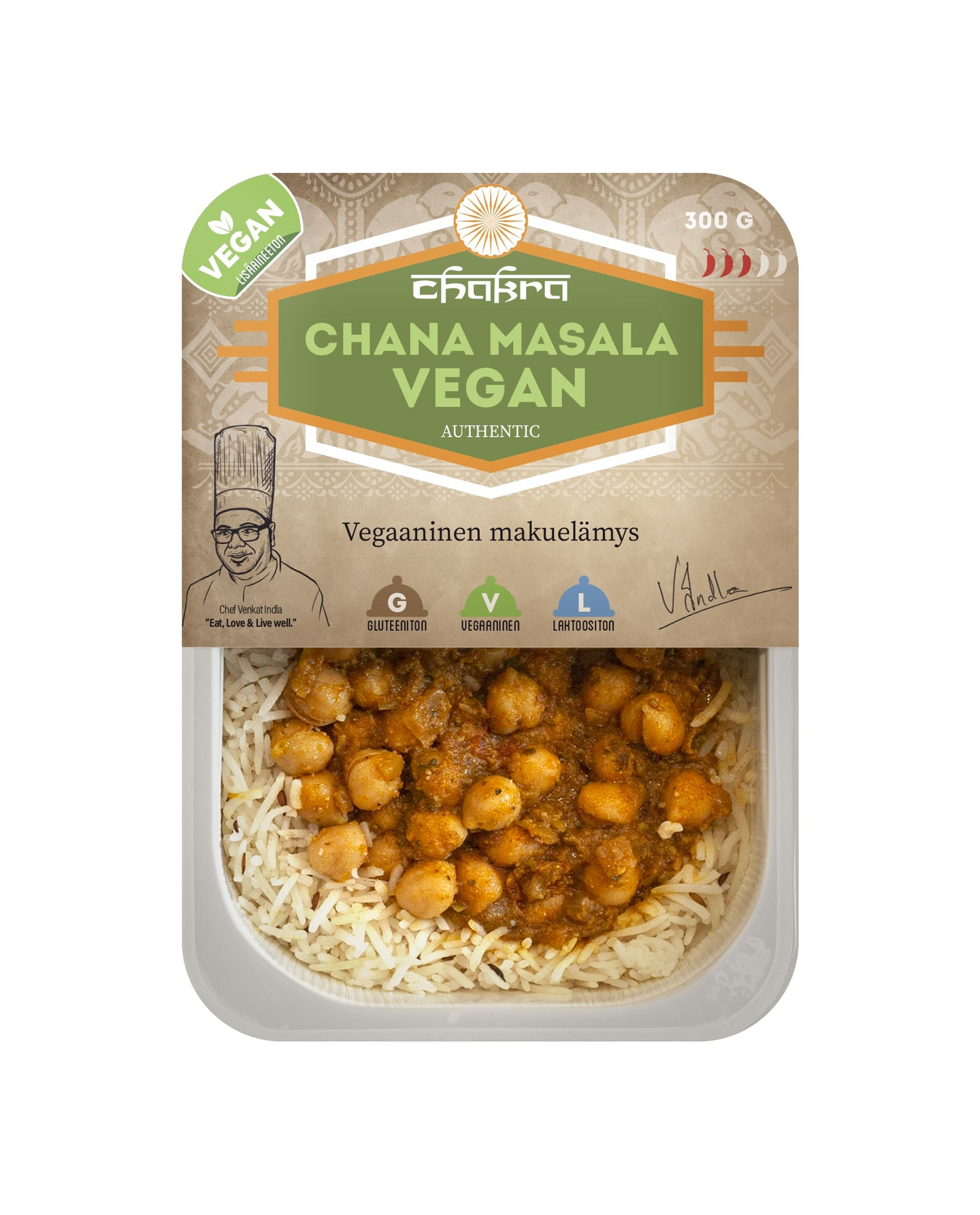 Täyteläinen curry, kikherneitä ja 15 tarkoin valittua maustetta. Chakran vegaaninen Chana Masala on Pohjois-Intian kasvisklassikko, joka hurmaa syvillä mauillaan ja autenttisella lämmöllään. Annos on vegaaninen, laktoositon ja gluteeniton. Chakra Meals -annokset on suunnitellut Etelä-Intiassa syntynyt huippukokki Venkat Indla, joka oppi kokkaamaan äidiltään jo lapsena. Hänen perinnereseptinsä on hiottu ravintolamaailmassa huippuunsa – ja nyt samat aidot intialaiset maut löytyvät suoraan kauppasi hyllyltä.