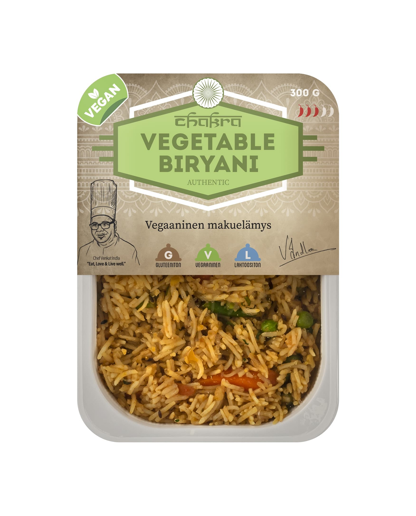 Aromikas basmatiriisi, käsin pilkotut kasvikset ja tarkoin valitut mausteet. Chakran Vegetable Biryani pohjautuu kokki Venkat Indlan juurille Hyderabadiin, jossa Biryani on enemmän kuin ruoka – se on ylpeyden aihe. Annos on vegaaninen, laktoositon ja gluteeniton. Chakra Meals -annokset on suunnitellut Etelä-Intiassa syntynyt huippukokki Venkat Indla, joka oppi kokkaamaan äidiltään jo lapsena. Hänen perinnereseptinsä on hiottu ravintolamaailmassa huippuunsa – ja nyt samat aidot intialaiset maut löytyvät suoraan kauppasi hyllyltä.