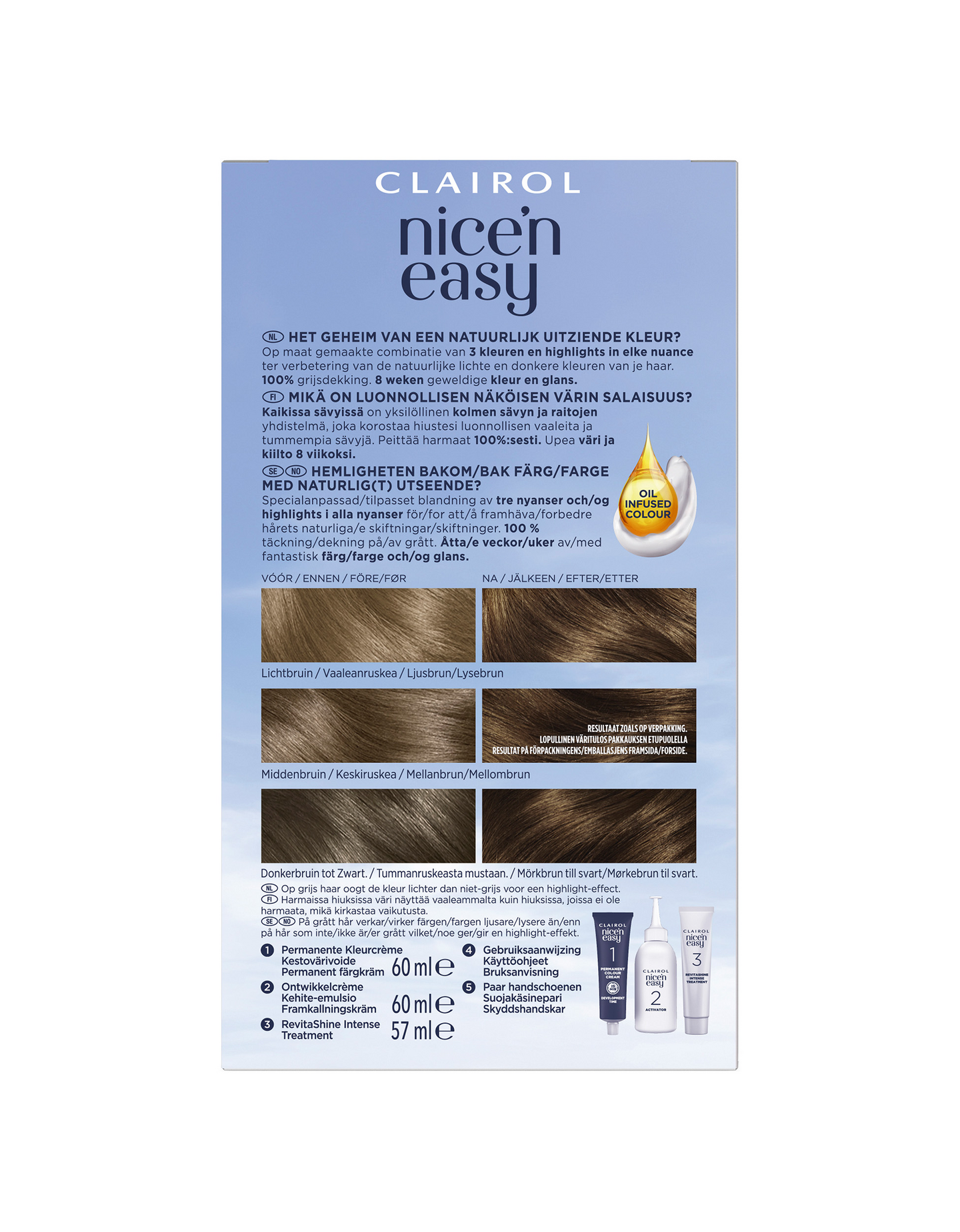 Clairol Nice'n Easy on luonnollisen näköinen hiusväri, joka sisältää sekoituksen kolmea sävyä korostaen hiusvärin eri vivahteita. Sen öljyä sisältävä koostumus ja Revitashine-teknologia jättävät hiukset sileiksi ja vahvoiksi.
