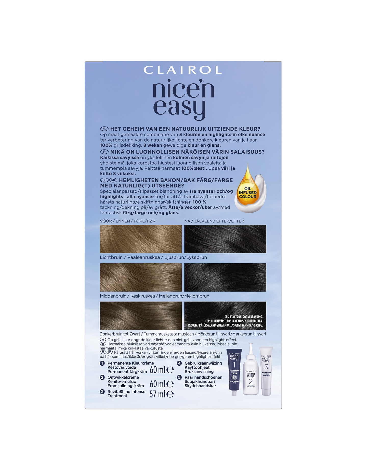 Clairol Nice'n Easy on luonnollisen näköinen hiusväri, joka sisältää sekoituksen kolmea sävyä korostaen hiusvärin eri vivahteita. Sen öljyä sisältävä koostumus ja Revitashine-teknologia jättävät hiukset sileiksi ja vahvoiksi.