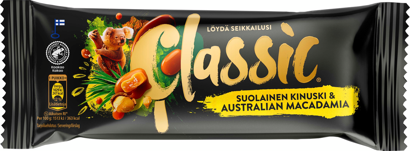 Classic Suolainen Kinuski & Australian Macadamia jäätelöpuikossa suomalaiseen makuun täydellisesti sopiva maitosuklaakuorrute täydentyy paahteisilla macadamiapähkinäkrokanteilla. Se kietoo sisälleen täyteläistä vaniljakermajäätelöä ja suolaista kinuskikastiketta. Rouskuvat macadamiapähkinäkrokantit tulevat Australian auringosta. Testaa eri Classic-jäätelöitä ja löydä lempiseikkailusi! Classic on lupaus korkealaatuisesta, täyteläisestä kermajäätelöstä ja suussa sulavasta suklaakuorrutteesta! Kaikki Classic- jäätelöt valmistetaan Suomessa, Turengin jäätelötehtaalla. Tuotteissamme on Avainlippu- merkintä. Classic-jäätelöissä käytetään vain Rainforest Alliance -sertifioitua kaakaota ja luontaisia aromeja. Lisätietoja ra.org. Kaikki pakkauksemme ovat 100 % kierrätettäviä: kääre kierrätetään muovinkeräykseen ja tikku biojätteeseen.