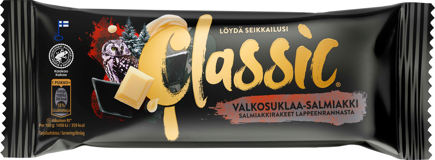 Classic Valkosuklaa-Salmiakki jäätelöpuikko hemmottelee salmiakin ystäviä. Samettisen valkosuklaakuorrutteen seassa on maukkaita salmiakkirakeita ja kuorutteen alla vaniljakermajäätelöä lakritsikastikkeella. Rouheat salmiakkirakeet tulevat Lappeenrannasta. Testaa eri Classic-jäätelöitä ja löydä lempiseikkailusi! Classic on lupaus korkealaatuisesta, täyteläisestä kermajäätelöstä ja suussa sulavasta suklaakuorrutteesta! Kaikki Classic- jäätelöt valmistetaan Suomessa, Turengin jäätelötehtaalla. Tuotteissamme on Avainlippu- merkintä. Classic-jäätelöissä käytetään vain Rainforest Alliance -sertifioitua kaakaota ja luontaisia aromeja. Lisätietoja ra.org. Kaikki pakkauksemme ovat 100 % kierrätettäviä: kääre kierrätetään muovinkeräykseen ja tikku biojätteeseen.