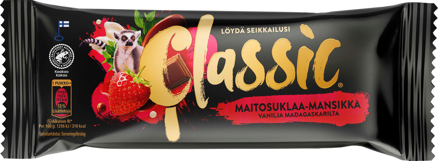 Classic Maitosuklaa-Mansikka jäätelöpuikko ihastuttaa marjaisuudellaan. Klassisen maitosuklaakuorrutteen alla on mansikkakermajäätelöpuikko, jonka keskellä on täyteläinen vaniljakermajäätelösydän. Hienostunut vanilja tulee Madagaskarilta. Testaa eri Classic-jäätelöitä ja löydä lempiseikkailusi! Classic on lupaus korkealaatuisesta, täyteläisestä kermajäätelöstä ja suussa sulavasta suklaakuorrutteesta! Kaikki Classic- jäätelöt valmistetaan Suomessa, Turengin jäätelötehtaalla. Tuotteissamme on Avainlippu- merkintä. Classic-jäätelöissä käytetään vain Rainforest Alliance -sertifioitua kaakaota ja luontaisia aromeja. Lisätietoja ra.org. Kaikki pakkauksemme ovat 100 % kierrätettäviä: kääre kierrätetään muovinkeräykseen ja tikku biojätteeseen.