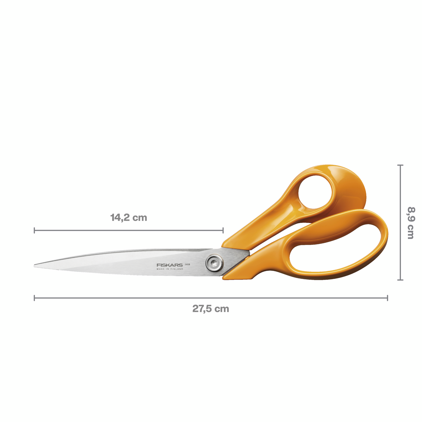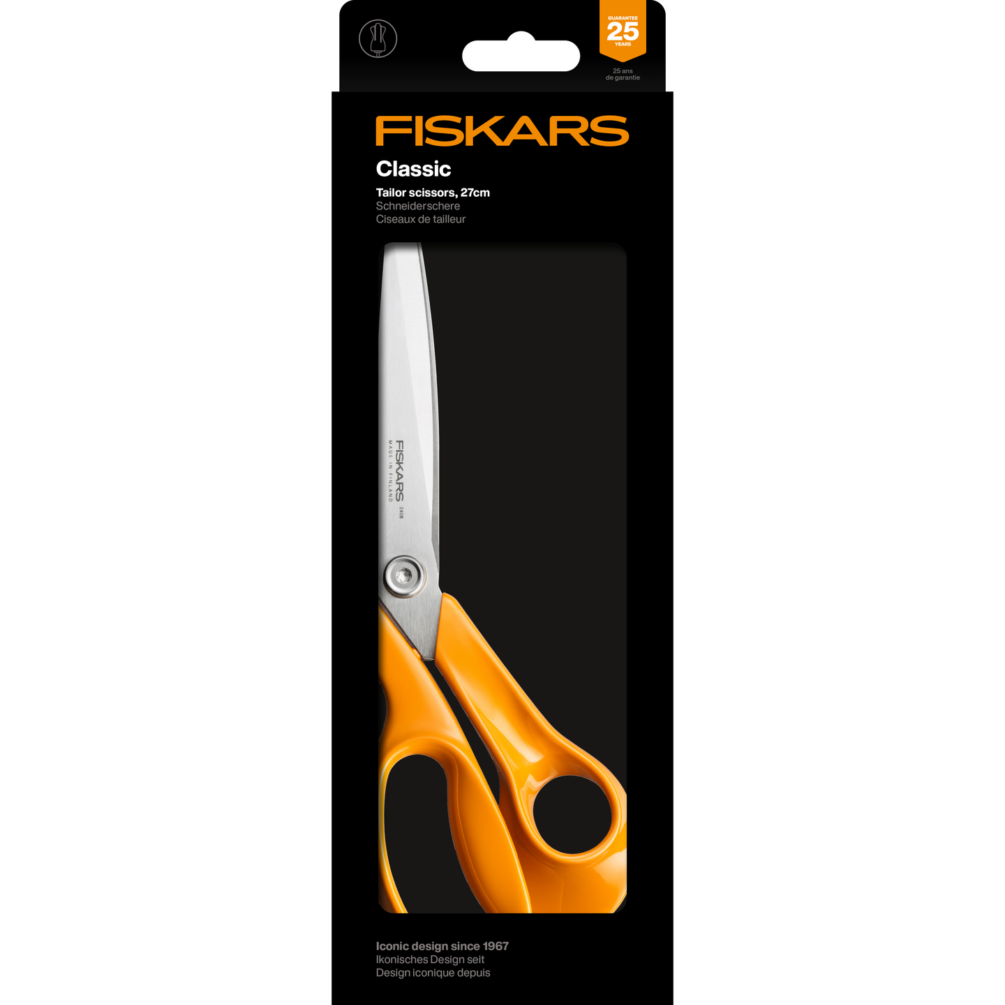 Ikoniset, oranssikahvaiset Classic-sakset tekevät luovista ideoista totta, ja ne auttavat arjen askareissa. Luotettavat ja korkealaatuiset Classic-sakset palvelevat käytössä pitkään ja ovat hyvä valinta, kun haluat ostaa vähemmän mutta parempaa. Räätälinsakset 27 cm soveltuvat paksujen ja ohuiden kankaiden vaivattomaan leikkaamiseen. Ne tarjoavat ihanteellisen leikkaavan terän ja erittäin pitkän käyttöiän. Pitkien terien fasettihionta mahdollistaa tarkan leikkaamisen pöydällä aivan terien kärkeen asti. Iso, ergonominen ja iskunkestävä kädensija takaa hyvän otteen. Valmistettu Suomessa rautaisella ammattitaidolla. Kaikki saksemme viimeistellään ja testataan käsin korkean laadun takaamiseksi. Ikonisen suunnittelun, laatumateriaalien sekä mittavan kokemuksemme ja ammattitaitomme ansiosta saksilla on ainutlaatuinen ja pitkä 25 vuoden takuu. Elämäsi sakset – jo vuodesta 1967.