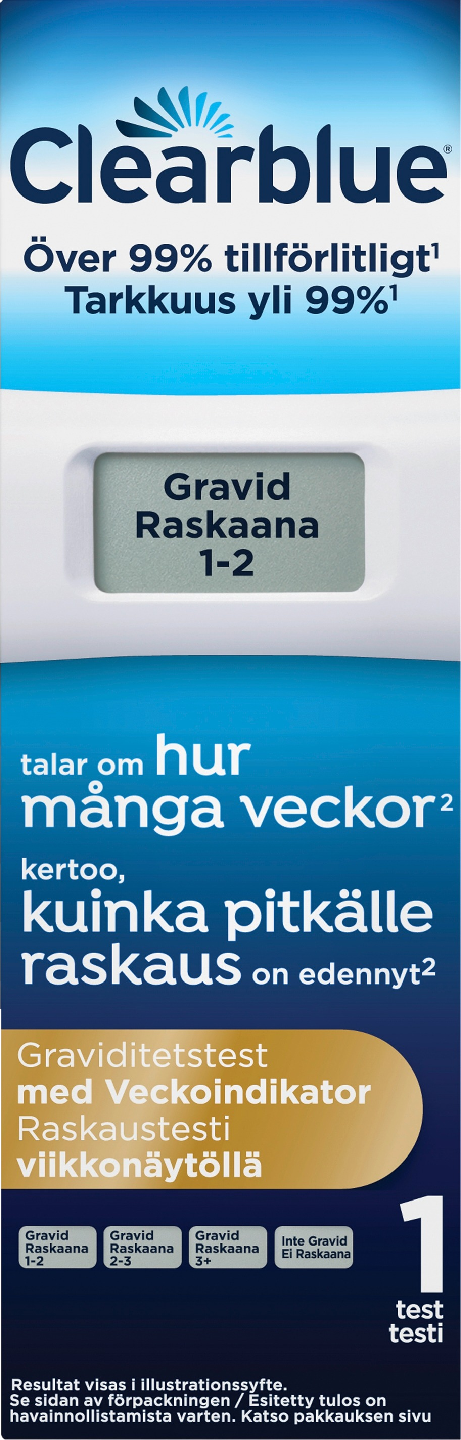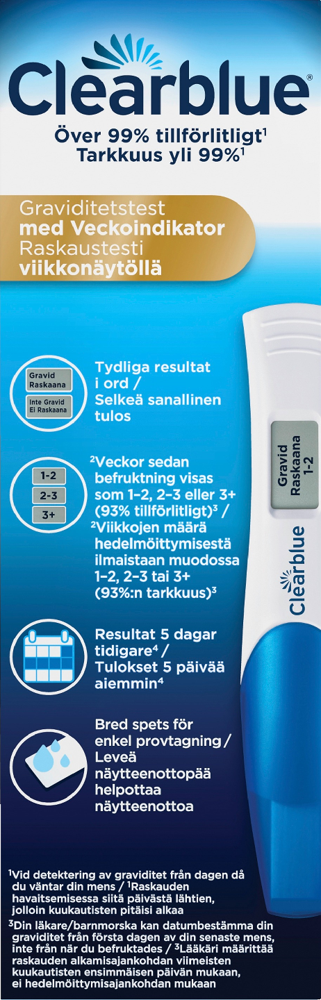 Viikkonäytöllinen Clearblue Digital -raskaustesti on ensimmäinen ja ainoa testi, joka tunnistaa raskauden keston yhtä tarkasti kuin ultraäänikuvaus (1). Älykäs kaksoistunnistin kertoo digitaalisella näyttöruudulla sanallisesti paitsi sen, oletko raskaana vai et, myös sen, kuinka pitkällä raskaus on – hedelmöittymisestä kuluneet viikot näykyvät näytössä muodossa 1–2, 2–3 tai 3+. (2) Tällä kotikäyttöisellä raskaustestisarjalla voit testata 5 päivää ennen kuukautisten väliinjäämistä (4 päivää ennen kuukautisten oletettua alkamispäivää). Raskaana-tuloksista 65 % voidaan havaita 5 päivää ennen kuukautisten väliinjäämistä. Jotta viikkonäytön tulos olisi tarkka, sinun on käytettävä aamun ensimmäistä virtsaa. (1) Viikkonäyttö antoi 97 prosentissa tapauksista saman tuloksen kuin myöhempi varhaisraskauden ultraäänitutkimus. Tulokset perustuvat tutkimukseen, jossa verrattiin 187 naisen viikkonäytöllä saatuja tuloksia ultraäänitutkimustuloksiin.