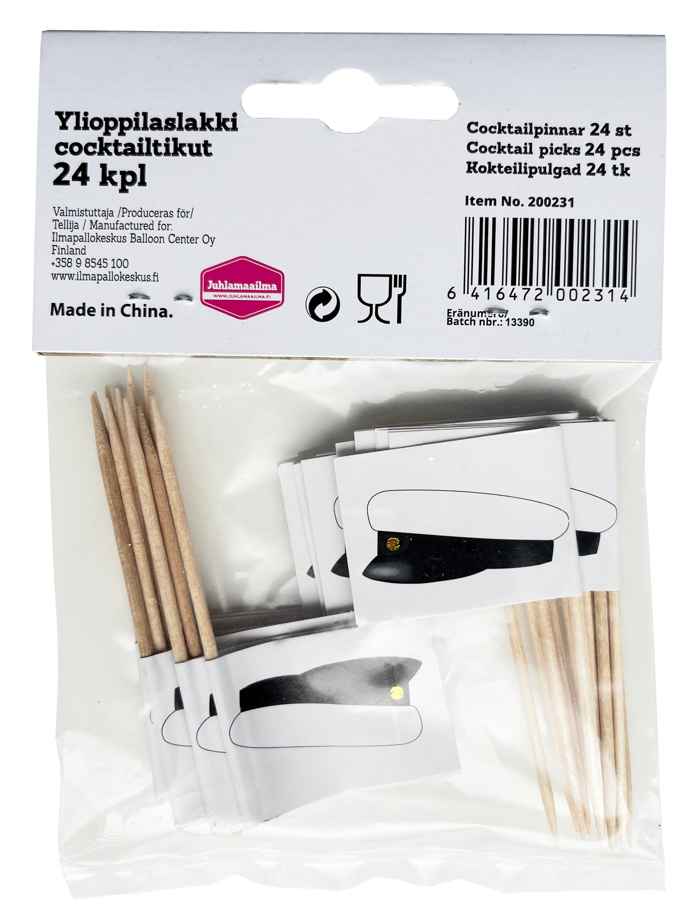 Tuo ripaus iloa leivonnaisiin ja kakkuihin ylioppilaslakki cocktailtikuilla! Pakkauksessa on 24 tikkua, jotka sopivat täydellisesti erilaisiin leivonnaisiin ja kakkuihin valmistujaisissa. Näillä tikuilla voit koristella herkkusi juhlavasti ja tehdä juhlasta unohtumattoman. Ylioppilaslakki cocktailtikut ovat loistava tapa nostattaa tunnelmaa ja juhlan henkeä!