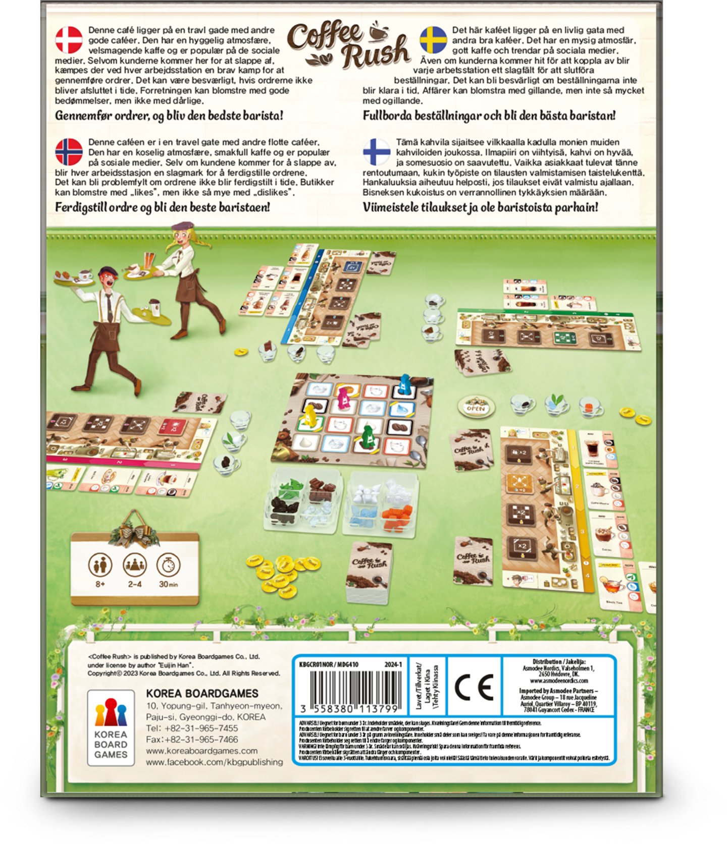 Tule parhaaksi baristaksi täyttämällä nopeasti kahvi- ja juomatilaukset. Kuppi kahvia on varmasti rentouttavaa - asiakkaalle. Kahvilan kannalta tilaukset kuitenkin kasaantuvat ruuhka-aikoina, eikä Coffee Rushissa ole tänäänkään toisin. Tavoitteenasi on: Täytä asiakkaiden tilaukset, jotta arvosanasi nousevat ja sinut tunnustetaan parhaaksi baristaksi! Tarkemmin sanottuna kukin pelaaja liikkuu ainesosataululla kerätäkseen ainesosia, joita hän tarvitsee tilausten täyttämiseen - ja tilausten täyttäminen nostaa luokitustasi. Tilauksia, joita ei ole täytetty ajoissa, tulee rangaistuksia, jotka vähentävät luokitustasi. Jos pelaaja on täyttänyt kolme tilausta, hän voi aktivoida parannuksen, jonka avulla hän voi hankkia ainesosia helpommin. Peli päättyy, kun kaikki tilauskortit ovat loppuneet tai kun barista kerää viidennen rangaistuskorttinsa. Pelaaja, jolla on korkein luokitus, voittaa! + 8 vuotta, 2-4 pelaajaa, peliaika 30 minuuttia.