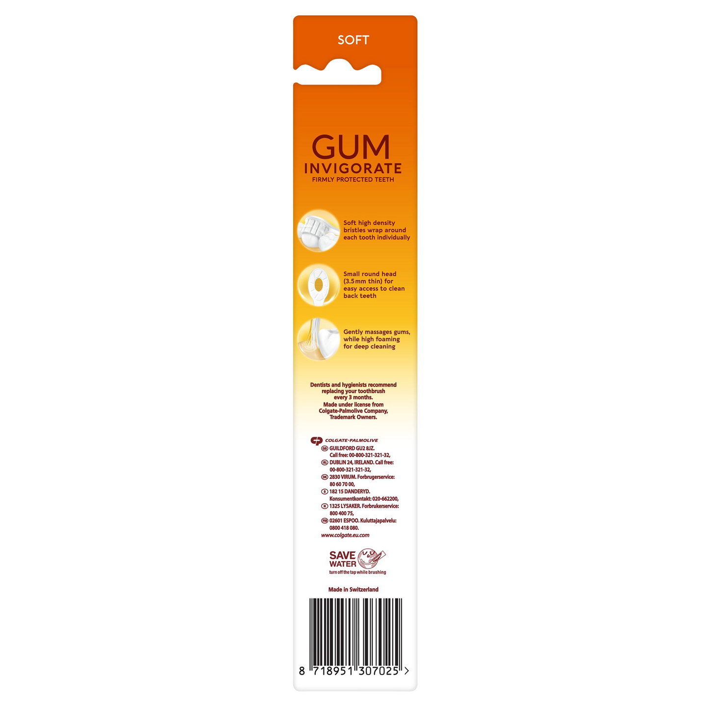 Ihastu Colgate Gum Invigorate -hammasharjan tuomaan puhtauden tunteeseen! Harjan pehmeät, ohukärkiset ja tiheät harjakset kietoutuvat hampaiden ympäri puhdistaen ne tehokkaasti ja tarkasti. Harjan pieni, ympyrän mallinen pää on vain 3,5 millimetriä leveä ja se ylettyy helposti ja mukavasti takahampaisiin samalla kun sen tiheät harjakset hierovat ikeniä hellästi. Harjakset myös vaahdottavat hammastahnan tehokkaasti, mikä auttaa sitä leviämään koko suuhun paremmin.