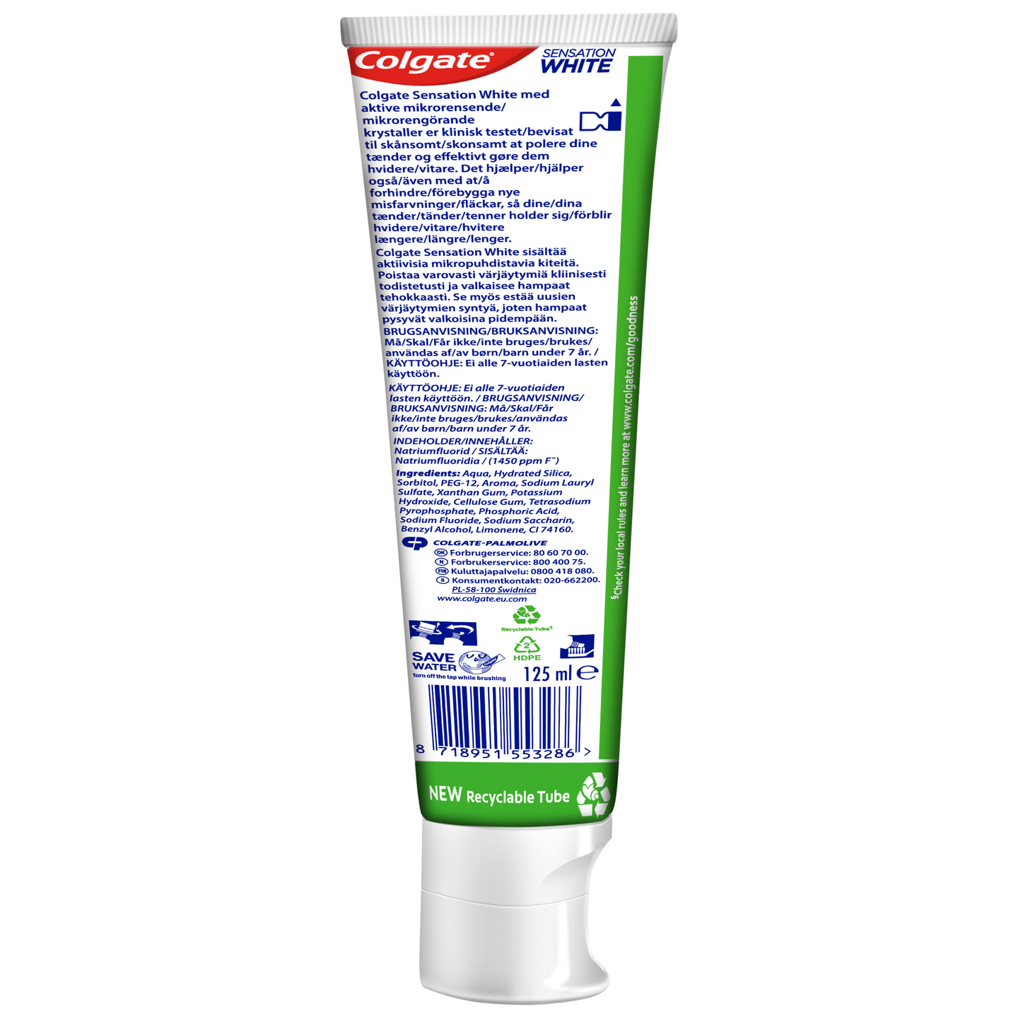Colgate Sensation White -hammastahna on turvallinen ja tehokas tapa pitää suusi terveenä ja hampaasi valkoisina pidempään. Sen koostumus sisältää aktiivisesti puhdistavia mikrokristalleja, joiden teho on kliinisesti todistettu. Ne kiillottavat ja vaalentavat hampaitasi jo 10 päivässä*, ja ehkäisevät uusien värjäytymien muodostumista. Tulee kierrätettävässä tuubissa. *Käytettynä 2 kertaa päivässä.