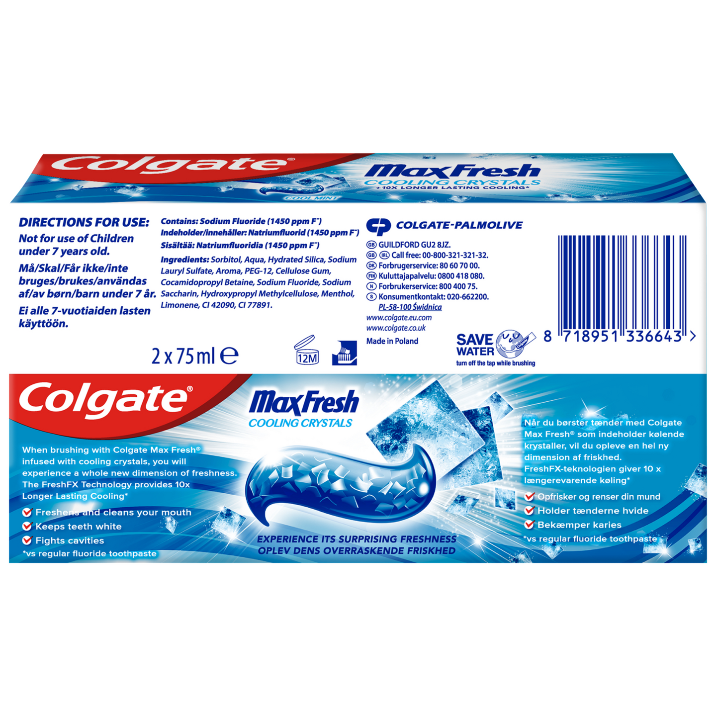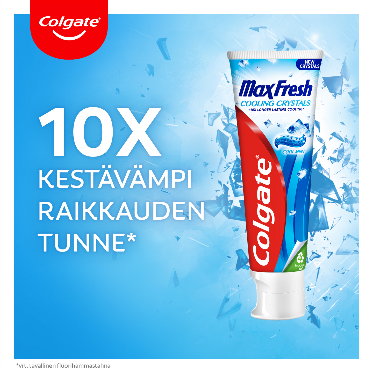 Pidä hampaasi terveinä ja suusi raikkaana Colgate Max Fresh Cooling Crystals -hammastahnan avulla. Sen tehokas koostumus sisältää viilentäviä kristalleja, jotka tuovat suuhusi aivan uudenlaisen raikkauden tunteen, joka FreshFX -teknologian avulla kestää 10 kertaa pidempään*. Hammastahna maistuu raikkaalta mintulta ja tulee kierrätettävässä tuubissa. 2-pack. *Verrattuna tavalliseen fluorihammastahnaan.