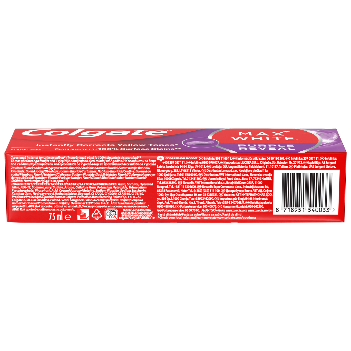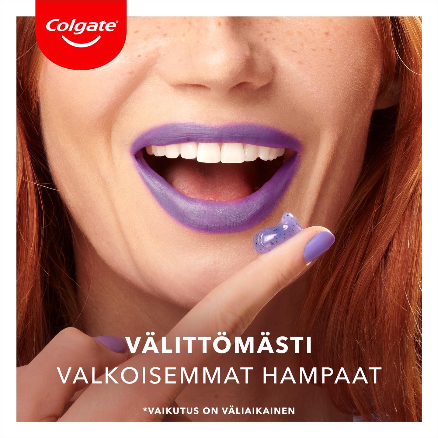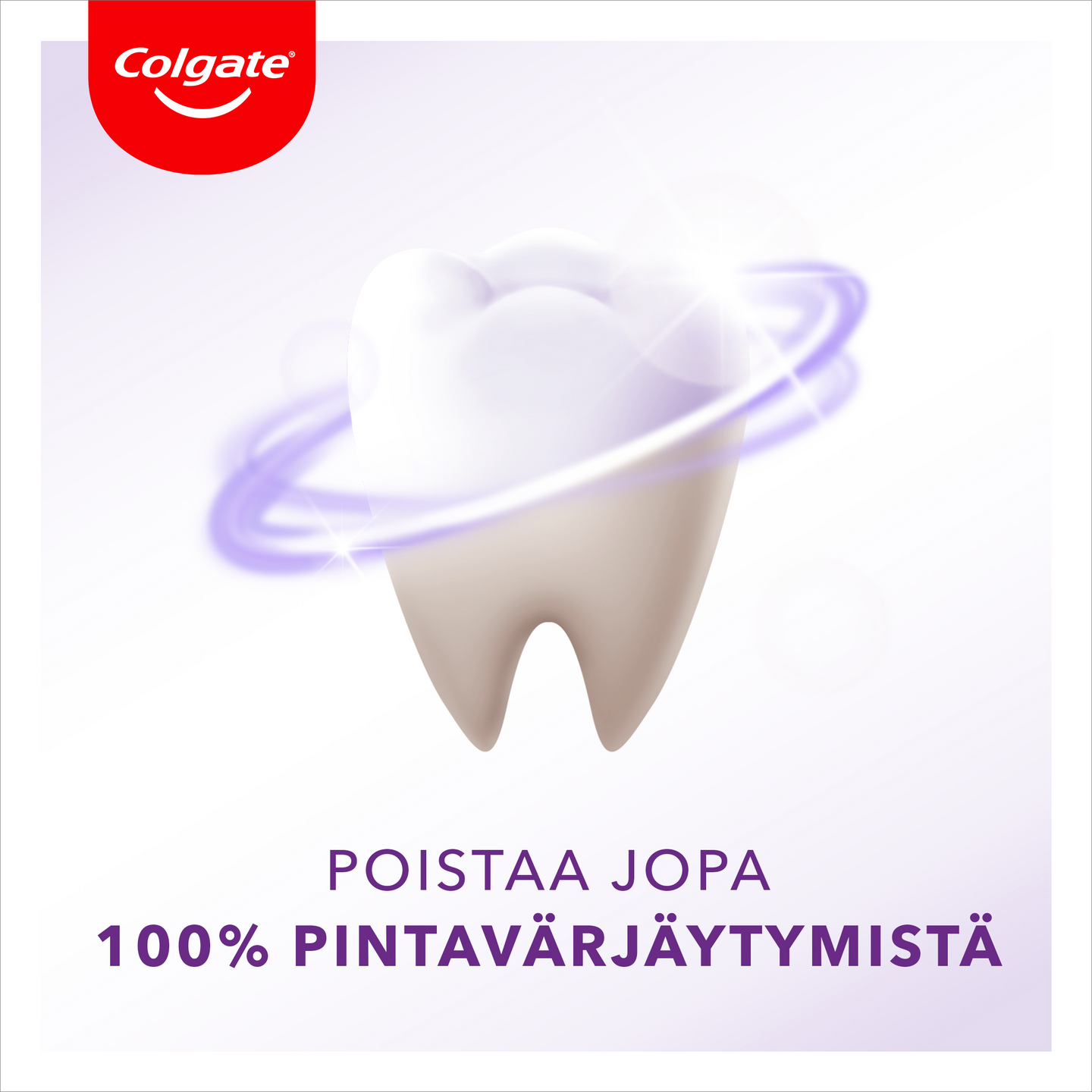 Tutustu Colgaten ensimmäiseen väriä korjaavaan purppura hammastahnaan, jonka optinen teknologia korjaa välittömästi* keltaisia sävyjä hampaista. Jatkuvassa käytössä, Colgate Max White Purple Reveal valkaiseva hammastahnan on kliinisesti todistettu myös poistavan jopa 100% hampaiden pintavärjäytymistä**, ja se sopii päivittäiseen käyttöön. Tämä väriä korjaava purppura hammastahna sisältää suositellun määrän fluoria, joten hampaasi saavat myös suojaa reikiintymiseltä. *Vaikutus on tilapäinen **Käytettynä kaksi kertaa päivässä, kahden viikon käytön jälkeen.