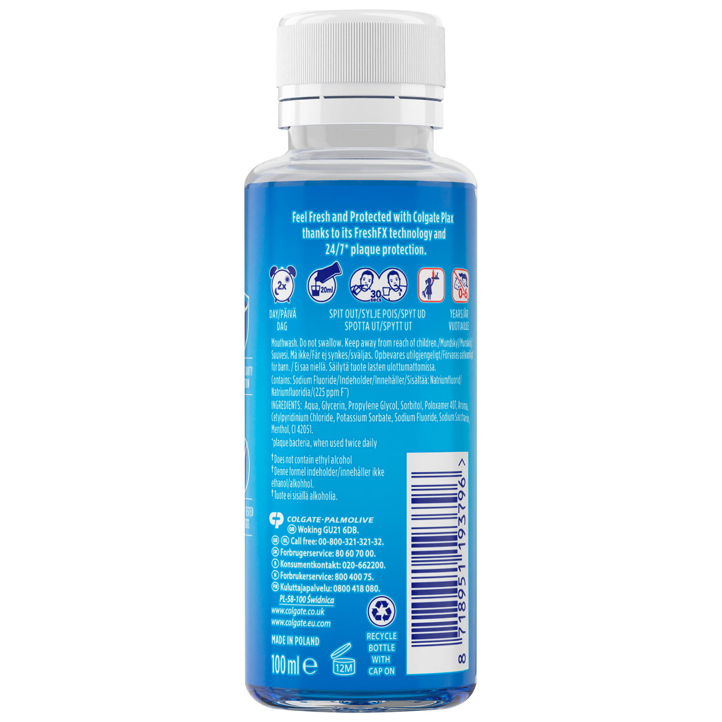 Colgate Plax Cool Mint on alkoholiton suuvesi, joka torjuu plakkia, bakteereita ja pahanhajuista hengitystä 24/7*. Suojaa reikiintymiseltä, vahvistaa kiillettä ja torjuu tehokkaasti bakteereita. Viileä mintun maku. Hammaslääkärien kliinisesti testaama. *Kun käytetään kaksi kertaa päivässä