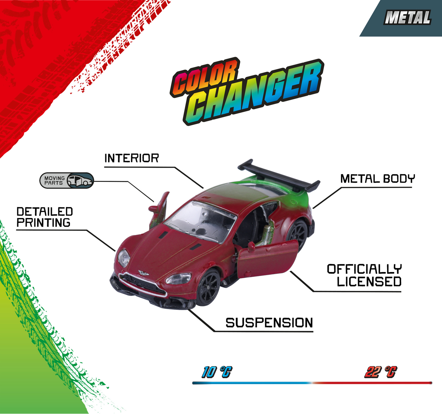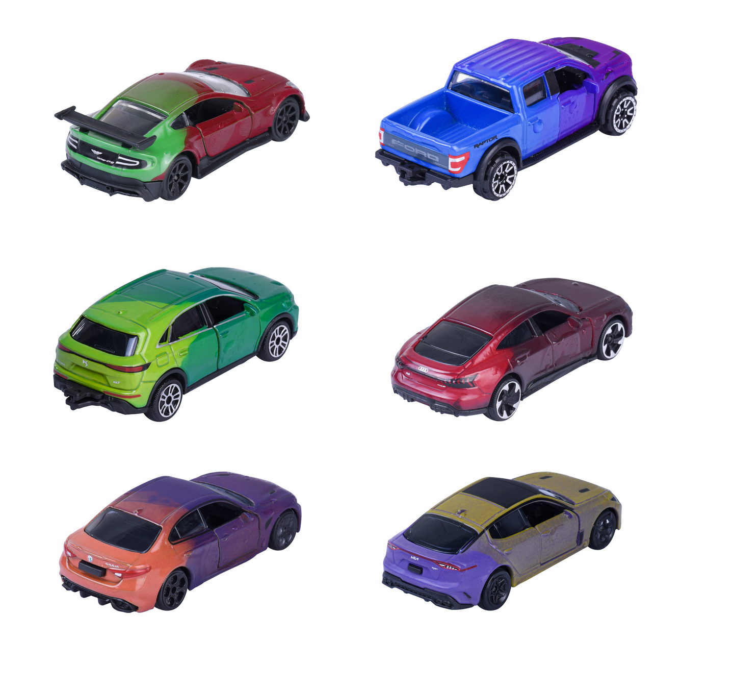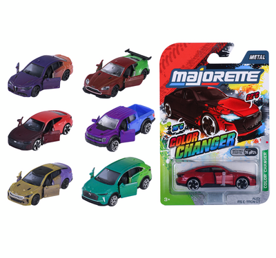 Majorette Color Changers - lämpötilalla on väliä! Nämä metallivaletut, die-cast autot eivät ole aivan samanlaisia kuin muut pikkuauot, vaan ne vaihtavat väriä lämpötilan mukaan. Auton väri muuttuu nopeasti, kun se altistuu kylmyydelle tai lämmölle. Väri vaihtuu melkein kuin taikaiskusta 10°C:n ja 22°C:n välisissä lämpötiloissa! Mallistossa on kuusi erilaista ajoneuvoa: Alfa Romeo Giulia Quadrifoglio, Ford T-150 Raptor, Audi RS e-tron GT, DS7 E-Tense, Aston Martin GT8, KIA Performance-sarjan auto. Kaikki ajoneuvot ovat aitojen automerkkien virallisesti lisensoimia. Auton koko 7,5 cm. Myydään yksittäin. Majoretten Colour Changers -pikkuautot sopivat erinomaisesti lahjaksi tai keräiltäväksi kaikille atuofaneille 3-vuotiaista alkaen.