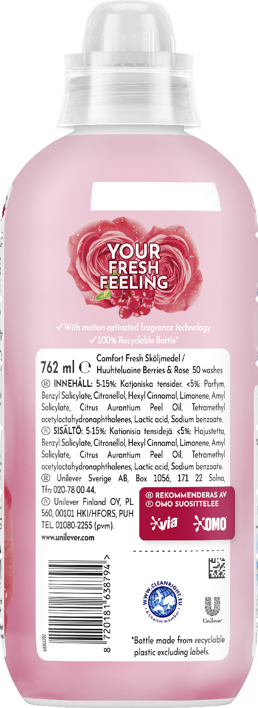 Comfort Berries & Rose -huuhteluaineen mieto puhdas tuoksu muistuttaa sinua kauniista kesäpäivistä. Huuhteluaineessa on puhdas makeiden marjojen tuoksu yhdistettynä klassiseen ruusun tuoksuun. Comfort Berries & Rose sopii täydellisesti sinulle, jolle miellyttävän pehmeä, ilmava ja raikas pyykki on tärkeää. Kun vaatteesi tuoksuvat hyvältä, tunnet olosi virkeämmäksi koko päivän. Comfort Berries & Rose -huuhteluaineen tuoksu on pitkäkestoinen. Huuhteluaineen ainesosat ovat pehmentäviä ja silottavat vaatteiden kuituja. Tämä helpottaa työtäsi, kun sinun on aika silittää vaatteita ja muita tekstiilejä. Comfort-huuhteluaine vähentää staattista sähköä ja auttaa varmistamaan, että vaatteidesi väri ja muoto säilyvät. Comfort-huuhteluaineen koostumus suojaa vaatteitasi epämiellyttäviltä tuoksuilta, jotta voit nauttia pidempään kestävästä raikkaudesta. Käytä seuraavasti: Kaada 15 ml:n annos Comfort Berries & Rose -huuhteluainetta suoraan pesukoneen huuhteluainelokeroon suosikkipesuaineesi viereen. Älä kaada suoraan kankaalle. Valitse ohjelma, käynnistä pesu ja anna koneen hoitaa loput. Comfort on aito ja alkuperäinen huuhteluaine, jota on käytetty vaatteiden hoidossa yli 50 vuoden ajan. Yhdestä Comfort huuhteluainepullosta saat 50 pesua. Huuhteluaineen pullo on valmistettu 100 % kierrätettävästä muovista, etikettejä lukuun ottamatta. Comfort-huuhteluaineen edut • Tekee vaatteista ja pyyhkeistä ilmavia, pehmeitä ja tuoksuvia • Vähentää staattista sähköä • Helpottaa vaatteiden silitystä ja muuta vaatehuoltoa • Säilyttää tekstiilien värin ja muodon • Antaa vaatteille raikkautta ja tuoksua, joka kestää koko päivän • Suojaa hajuilta