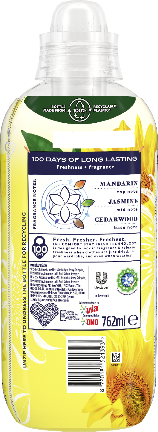 Comfort Sunfresh -huuhteluaine tekee pyykistäsi ihanan pehmeää ja antaa intensiivistä raikkautta joka pisarassa. Comfort Sunfresh on täydellinen huuhteluaine sinulle, joka arvostat ihanan ilmavaa ja pehmeää pyykkiä. Kun vaatteesi tuoksuvat hyvältä, tunnet myös olosi hyväksi – koko päivän. Siksi olemme kehittäneet Comfort Sunfresh -huuhteluaineen, joka tekee vaatteistasi raikkaita, pehmeitä ja tuoksuvia. Pitkäkestoinen puhdas ja mieto tuoksu, raikkaat ja pehmeät vaatteet ja tekstiilit. Comfort Sunfresh -huuhteluaineessa on kerroksellinen tuoksumaailma. Ylätuoksu sisältää mandariinia, keskituoksu jasmiinia ja setriä. Aisti luonnollinen ja raikas tuoksu, jota rakastat ympäri vuoden. Comfort on huuhteluaine, jolla on pehmentävä vaikutus pyykkiisi. Se silottaa vaatteiden kuituja, tekee niistä erityisen ilmavia, poistaa ryppyjä ja helpottaa silitystä. Huuhteluaine vähentää sähköisyyttä, suojaa pahoilta hajuilta ja auttaa säilyttämään vaatteidesi värin ja muodon, pesu pesulta. Suositun Comfort-huuhteluaineen uusi, parannettu koostumus tarjoaa täydellisen suojan vaatteillesi, jotta voit nauttia pidempään kestävästä raikkaudesta. Huuhteluaine on tiiviste, mikä pienentää pakkausta ja annostusta. Pakkaus on valmistettu 100 % kierrätetystä muovista ja se on 100 % kierrätettävä. Tuotteen pinta-aktiiviset aineet ovat 100 % biohajoavia. Käytä seuraavasti: Kaada 18 ml:n annos Comfort-huuhteluainetta suoraan pesukoneen huuhteluainelokeroon suosikkipesuaineesi viereen. Älä kaada suoraan kankaalle. Valitse ohjelma ja anna koneen hoitaa loput. Comfort on aito ja alkuperäinen huuhteluaine, jota on käytetty vaatteiden hoidossa yli 50 vuoden ajan. Yhdestä Comfort-huuhteluainepullosta saat 41 pesua. Comfort-huuhteluaineen edut • Tekee vaatteista ja pyyhkeistä pehmeitä ja tuoksuvia • Vähentää staattista sähköä • Helpottaa vaatteiden silitystä ja muuta vaatehuoltoa • Säilyttää tekstiilien värin ja muodon • Antaa vaatteille raikkautta, joka kestää koko päivän • Suojaa hajuilta