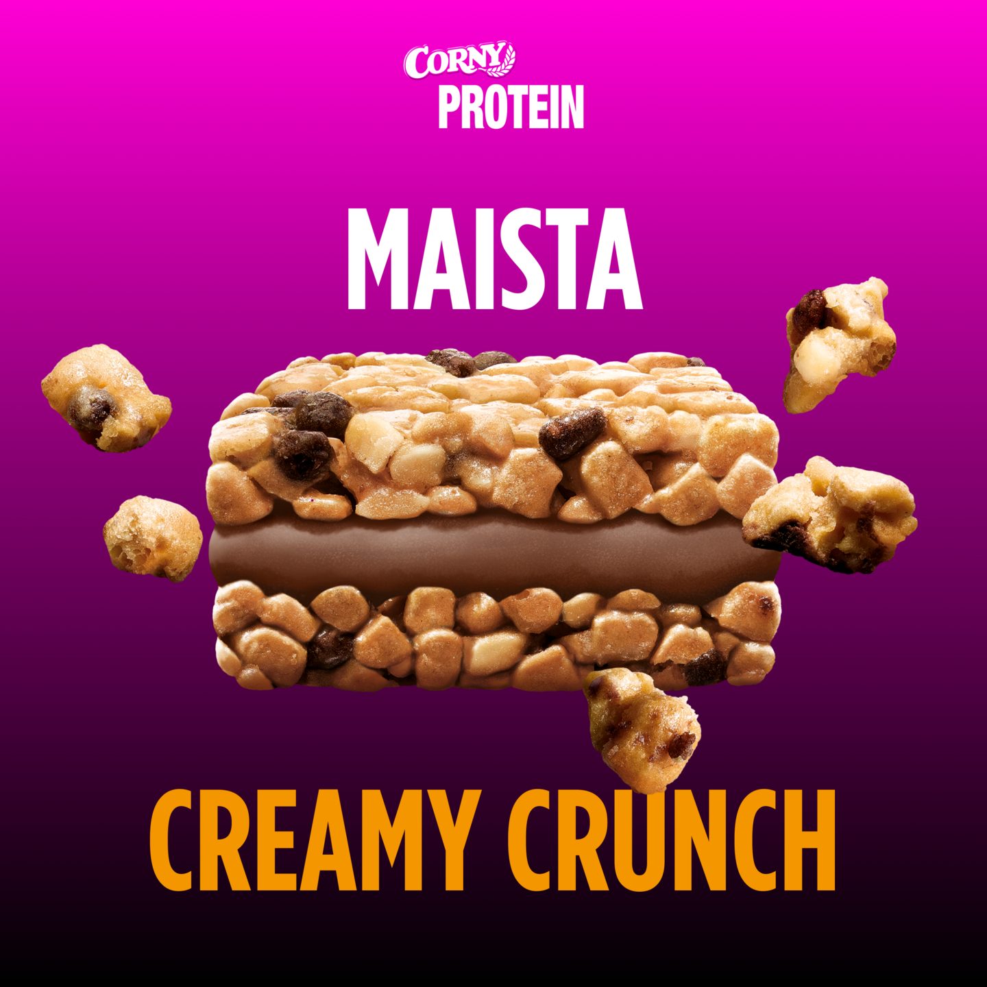 Kokeile uutta Corny Crunch & Cream Caramel Nougatia, erittäin maukasta proteiinipatukkaa, jossa on kolme kerrosta. Rapeat riisi- ja vehnämurot sekä täyteläinen karamelli- ja nougatkreemi on lyömätön yhdistelmä! Jokainen patukka sisältää 25 %proteiinia ja on myös täydennetty magnesiumilla, joka edistää normaalia lihasten toimintaa. Täydellinen välipala tai välipala, kun olet "liikkeellä" ja tarvitset hieman ylimääräistä proteiinia.