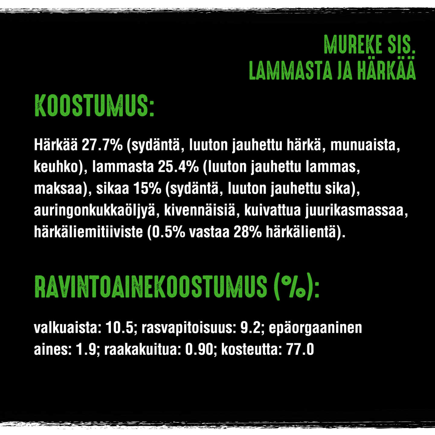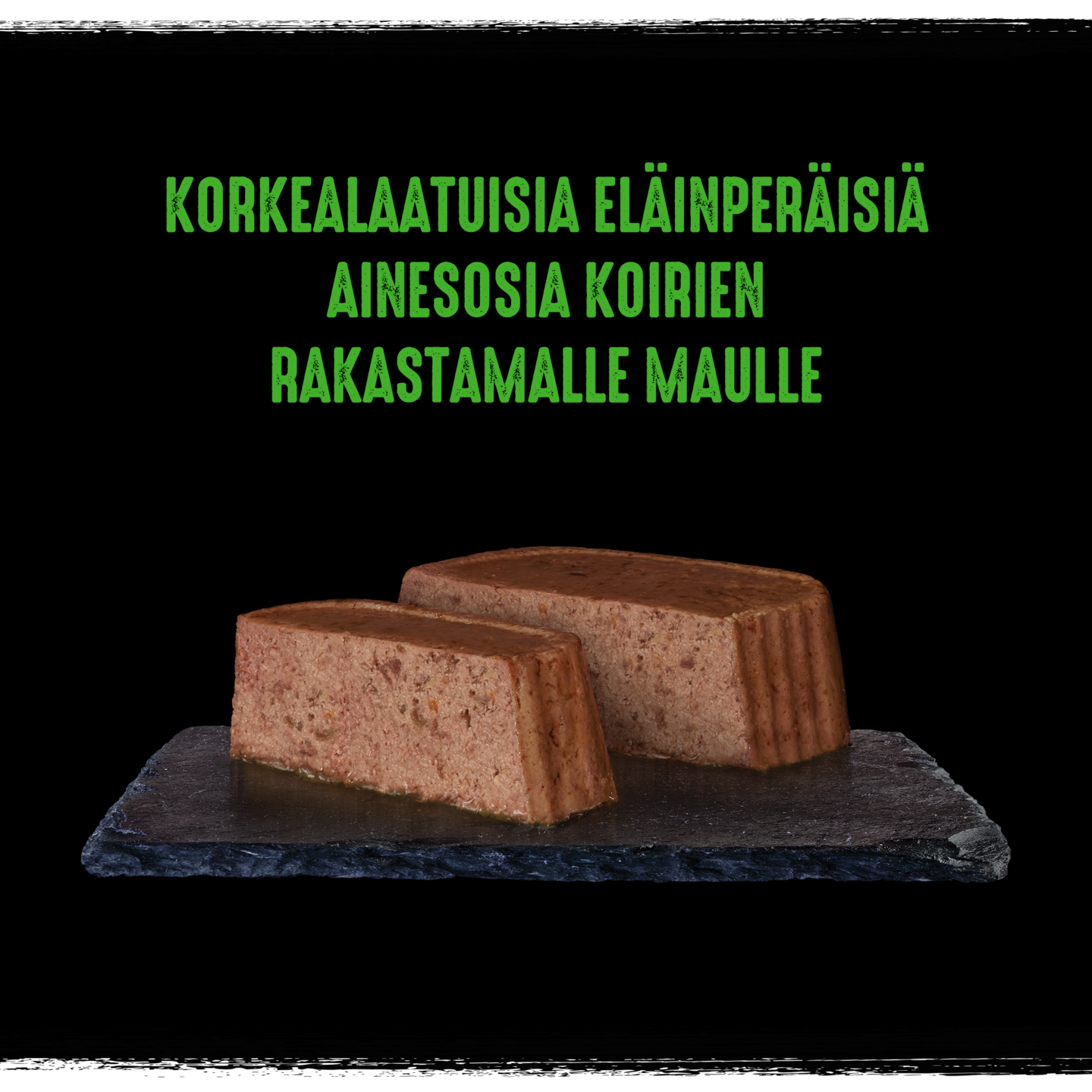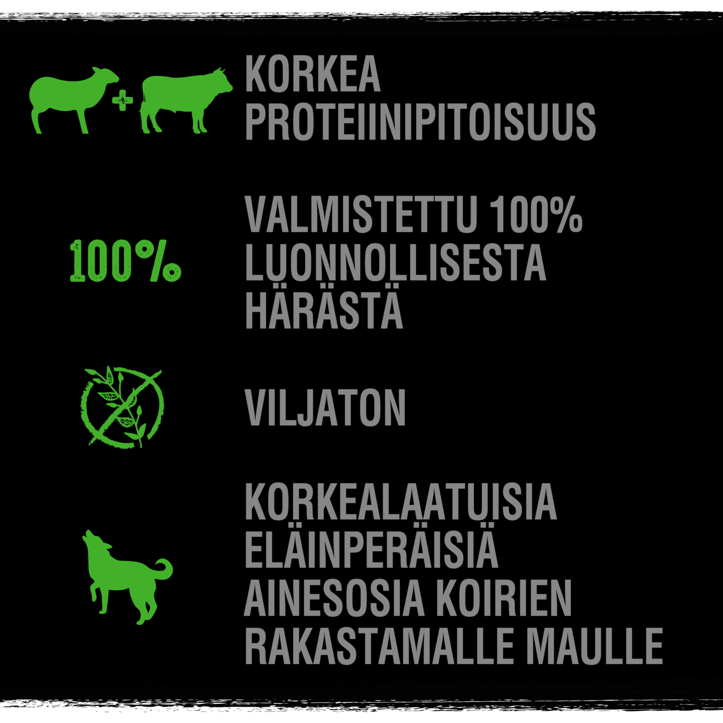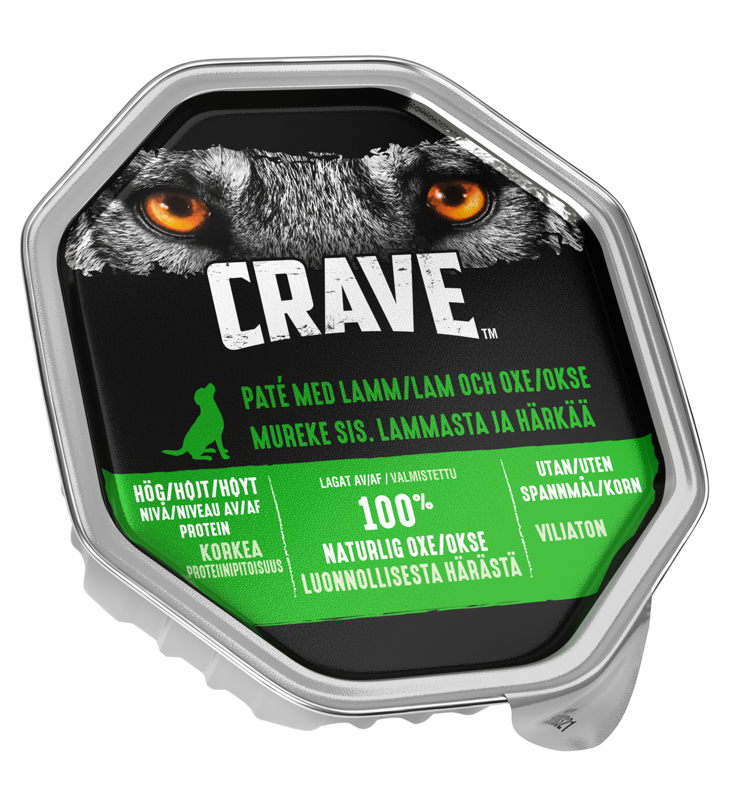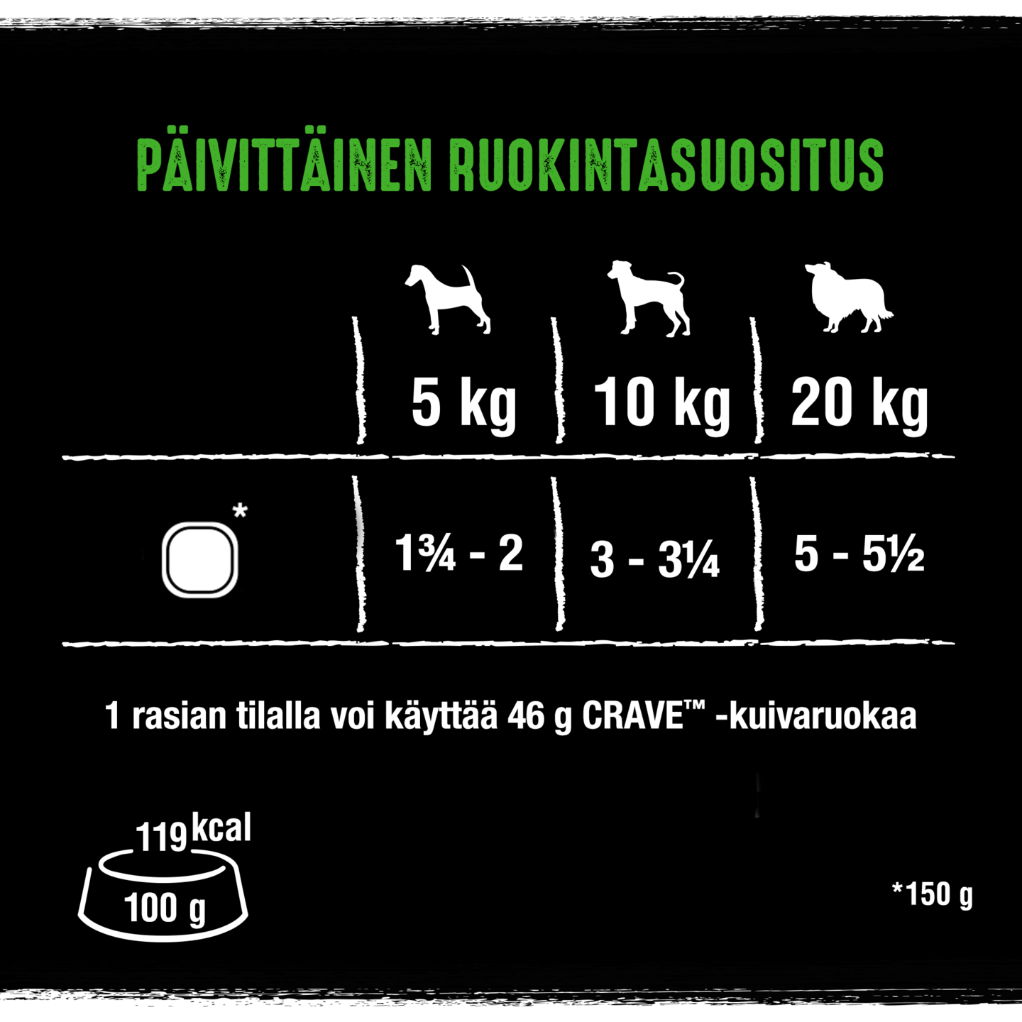 CRAVE™ koiran märkäruoka 150g on aikuisen koiran luontaisen ruokavalion inspiroima koiranruoka. Runsasproteiininen ja viljaton koiranruoka on valmistettu 100% luonnollisesta lampaan- ja häränlihasta, ja se on luotu tukemaan koirasi vahvoja ja terveitä lihaksia. Tiedostamme että koirat haluavat maukkaan, proteiinipitoisen ruokavalion - ja syy siihen on yksinkertainen. Proteiinirikas ravinto tarjoaa ravintoaineet vahvalle ja terveelle koiralle sekä oikean määrän energiaa leikkiin. Villien esivanhempiensa ruokavalion tapaan, CRAVE™ on herkullinen koiranruoka, joka tehdään laadukkaasta eläinproteiinista ja viljattomana.