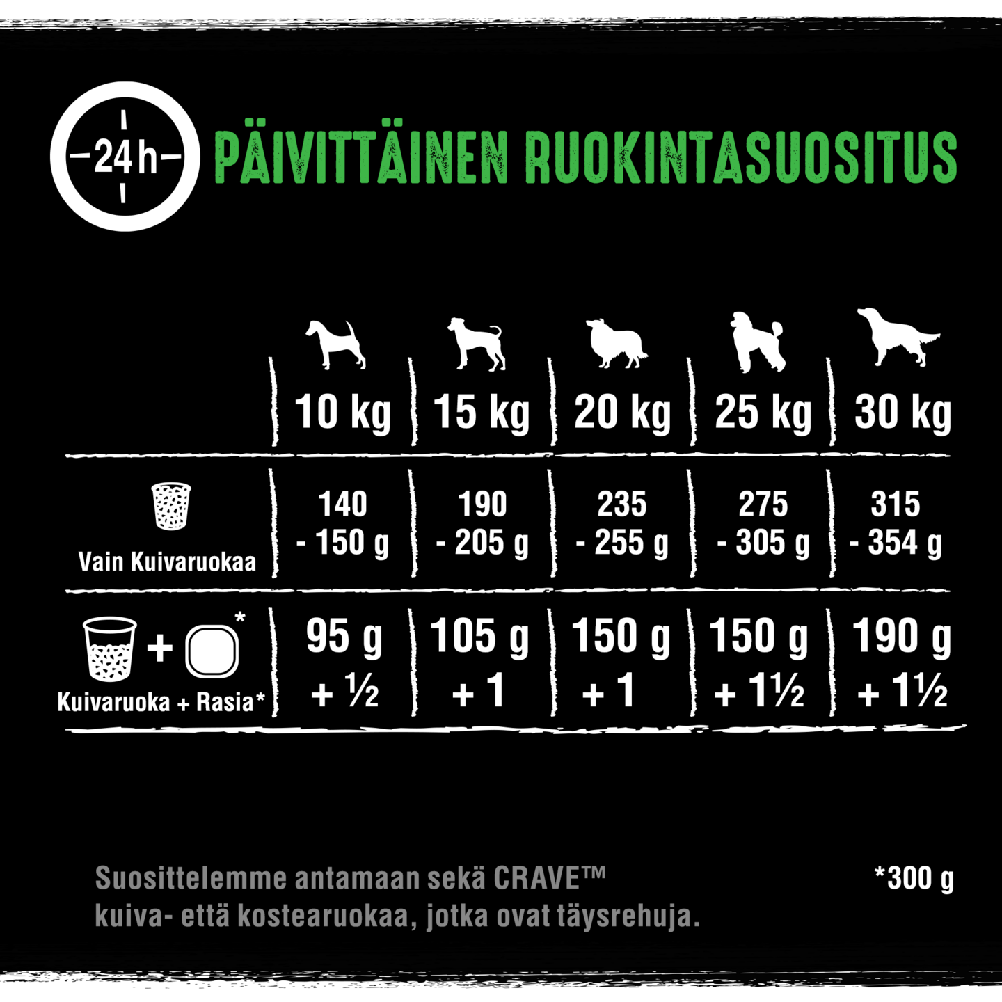 CRAVE™ on proteiinipitoinen ruokavalio koirallesi, joka imitoi koirien villien esivanhempien ruokavaliota. Täysravinto, joka sisältää vähintään 60% proteiinipitoisia eläinperäisiä ainesosia, kuten lammasta ja härkää. CRAVE™ koiran kuivaruoka on viljaton. - Liha on tärkein ainesosa: Vähintään 60% eläinperäisiä ainesosia - Korkea proteiinipitoisuus: 34% proteiinia, koirien villien esivanhempien ruokavalion innoittamana - Viljaton: ei maissia, vehnää tai soijaa, eikä keinotekoisia makuja, värejä tai aromiaineita - Proteiinipitoinen täysravinto, joka sisältää koirasi tarvitsemat korkealaatuiset ravintoaineet INSPIRED BY A DOG'S INSTINCTIVE DIET CRAVE™. SATISFY THEIR NATURE.™ Tiedostamme että koirat haluavat maukkaan, proteiinipitoisen ruokavalion - ja syy siihen on yksinkertainen. Proteiinirikas ravinto tarjoaa ravintoaineet vahvalle ja terveelle koiralle sekä oikean määrän energiaa leikkiin. Villien esivanhempiensa ruokavalion tapaan, CRAVE™ on herkullinen koiranruoka, joka tehdään laadukkaasta eläinproteiinista ja viljattomana.