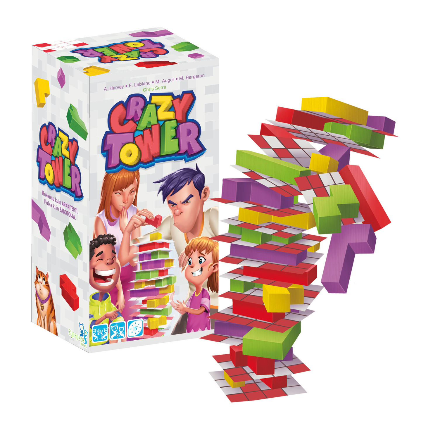 Crazy Tower -pelissä pinotaan eri muotoisia palikoita torniksi kerroskorttien mukaan. Tavoitteena on päästä eroon kaikista omista palikoista. Kolme pelivaihtoehtoa. Sisältö: 28 palikkaa, 21 kerroskorttia ja säännöt. 1-4 pelaajalle, yli 8-vuotiaille.