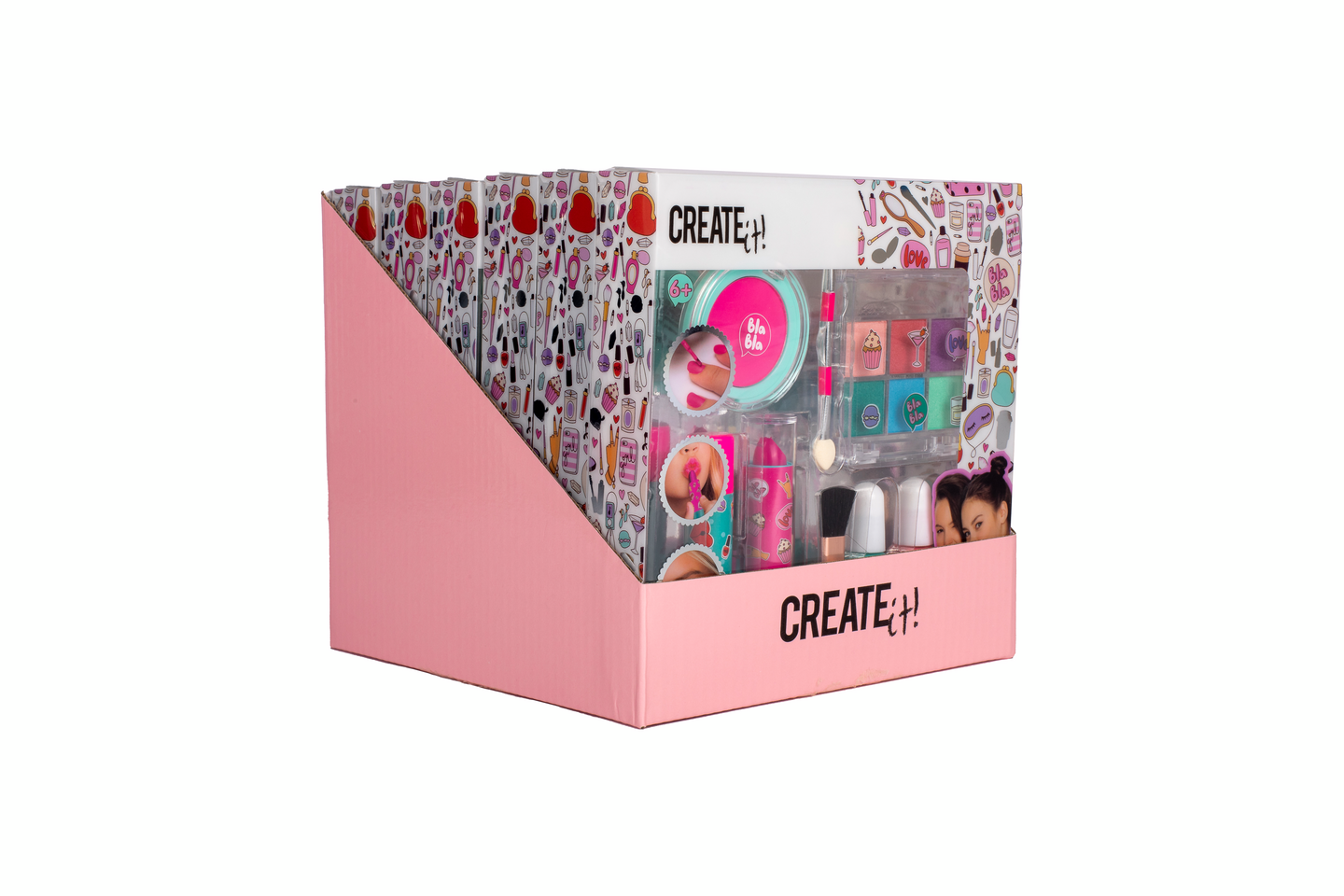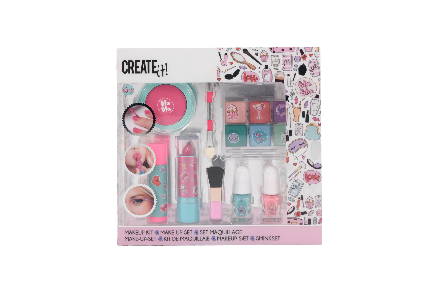 Create It! Meikkisetti pinkki/turkoosi. Setissä 6 luomiväriä ja sivellin. 2 huulipunaa, poskipuna ja sivellin sekä 2 kynsilakkaa. Ikäsuositus 6+