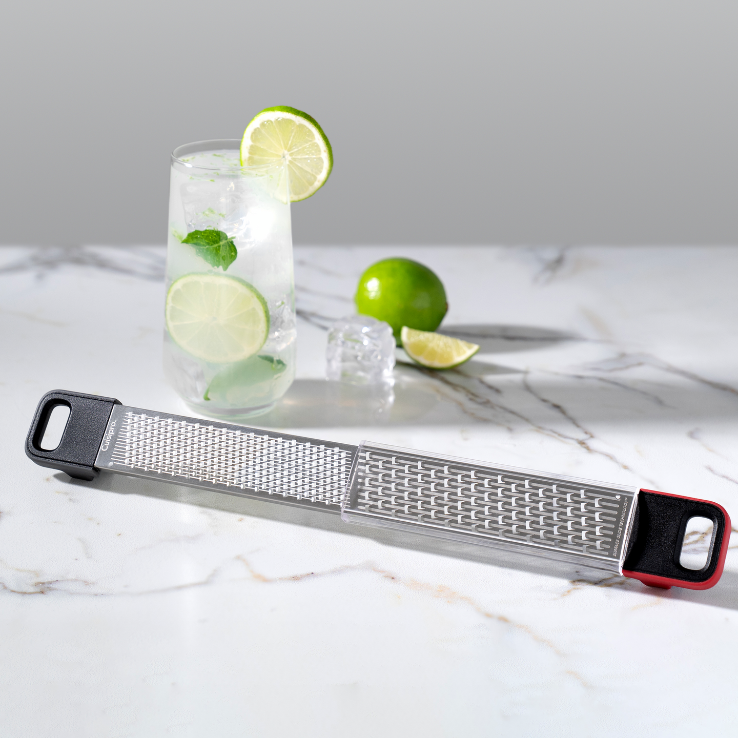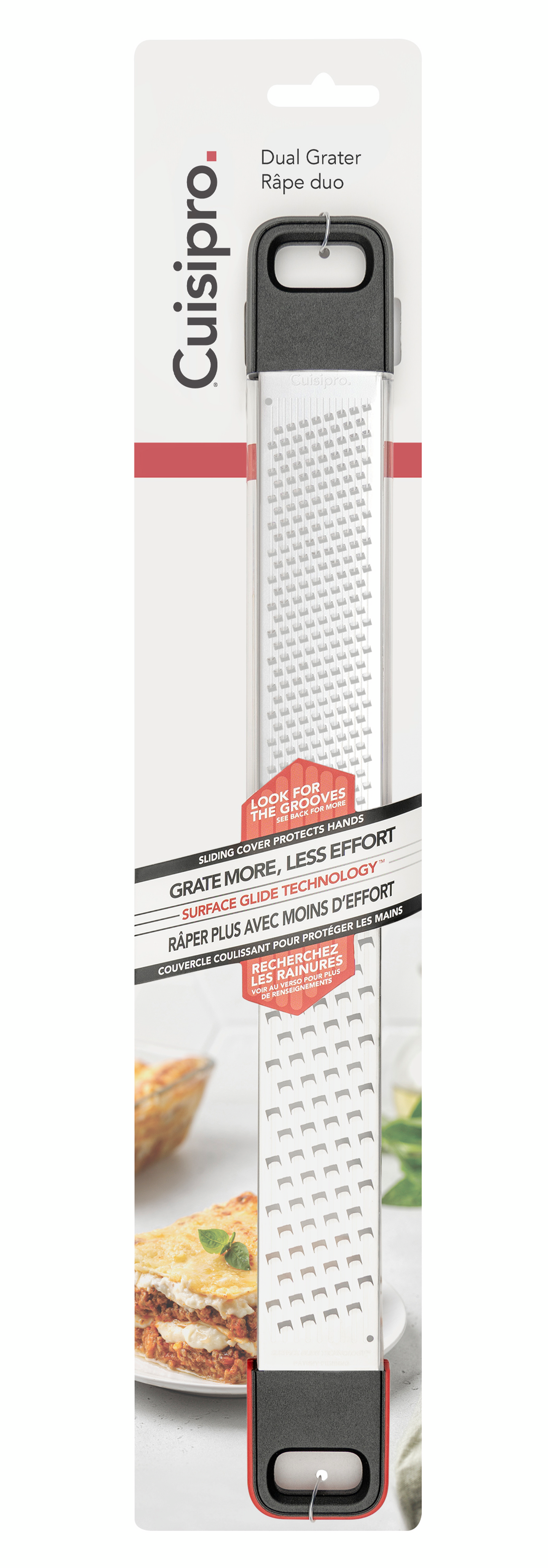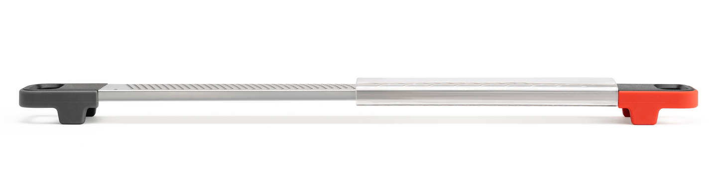 Käsisuojalla varustettu Deluxe Dual -raastin yhdistää kaksi eninten käytettyä raastinkarkeutta; hienon ja karkean. Hieno raastinosa sopii erinomaisesti mm. sitruunankuoren, suklaan tai muskottipähkinän raastamiseen, kun taas karkea on parhaimmillaan esim. pehmeitä juustoja ja vihanneksia raastettaessa. Cuisipron ainutlaatuinen, patentoitu uurrettu raastinpinta (SGT, surface glide technology) yhdistettynä veitsenteräviin etsattuihin raastinteriin takaa tehokkaan ja miellyttävän raastamiselämyksen - enemmän raastetta vähemmällä vaivalla. Raastimen molemmissa päissä on pienet jalat, jotka helpottavat raastimen tukemista pöytää tai leivontakulhoa vasten. Raastin kestää konepesun astianpesukoneen ylätasolla, mutta suosittelemme käsinpesua parhaan terävyyden säilyttämiseksi. Muoviselle käsisuojalle suosittelemme puhdistusta käsin tai astianpesukoneen ylätasolla matalassa pesulämpötilassa. Irrota käsisuoja raastimesta pesun ajaksi. Raastimen pituus 36,5 cm.