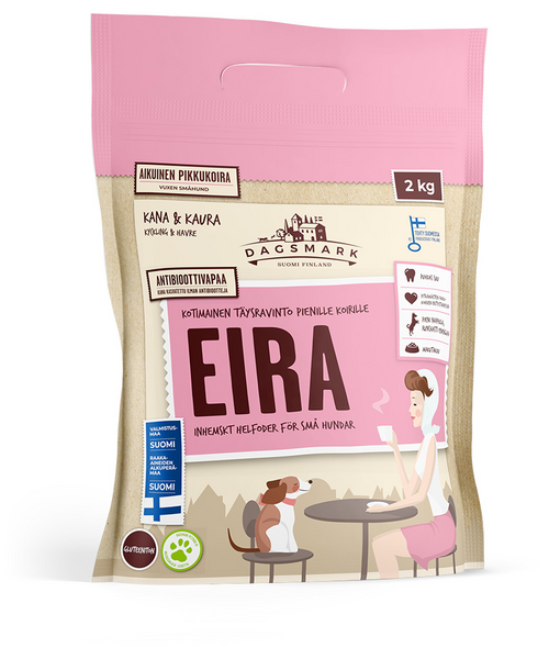 Suomalaisista raaka-aineista valmistettu kuivaruoka pienen koirasi hyvinvointia ajatellen. Ruoassa on maukas ja proteiinipitoinen koostumus ja sulavuudeltaan erinomaiset raaka-aineet. Uudistettu tuote vastaa paremmin pienten koirien suuriin tarpeisiin. Pieni maistuva nappula takaa riittävän energian saannin nirsoimmillekin pikkukoirille. Reseptissä on mietitty pitkäikäisten pikkukoirien hampaita, sydäntä ja niveliä. Ruoka sisältää C-vitamiinia, tauriinia, L-karnitiinia ja natriumheksametafosfaattia. Dagsmark EIRA sisältää mm. kanaa ja kauraa sekä kaikki koirasi tarvitsemat kivennäisaineet ja vitamiinit. Dagsmark EIRA ei sisällä vehnää, ei soijaa eikä aromi-, tai väriaineita.