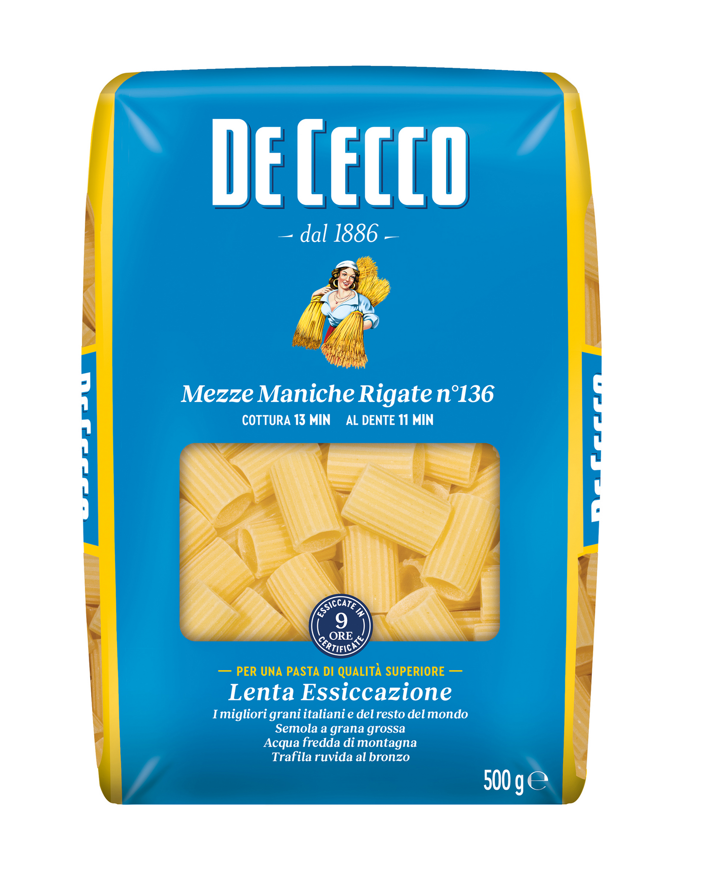 De Cecco Mezze Maniche Rigate on durumvehnästä valmistettu korkealaatuinen pasta. Italialainen De Cecco on premium-pastakategorian markkinajohtaja maailmanlaajuisesti ja yksi Italian suosituimmista pastamerkeistä. Pastat valmistetaan laadukkaista raaka-aineista uniikein valmistusmenetelmin, mikä takaa että pastat ovat ominaisuuksiltaan omaa luokkaansa.