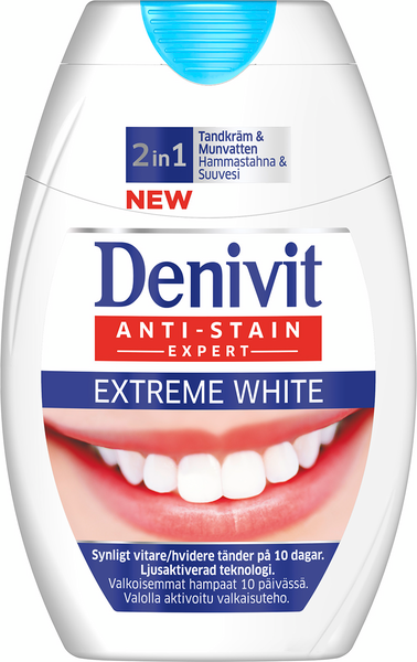 Denivit on valkoisten hampaiden asiantuntija. Denivit 2in1 -hammastahnassa yhdistyvät fluorihammastahna ja raikastava suuvesi. Tehokas koostumus poistaa plakkia ja värjäytymiä joka harjauskerralla. Harjauksen jälkeen hampaan pinnalle jää tehoaineita, jotka aktivoituvat valosta. Valo käynnistää vaalennusreaktion aina uudelleen. Raikas hengitys ja valkoisemmat hampaat 10 päivässä. Kehitetty yhteistyössä hammaslääkäreiden kanssa.