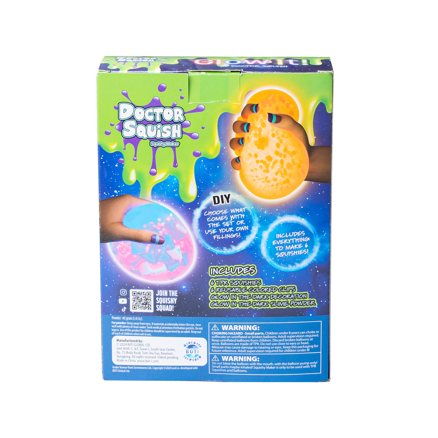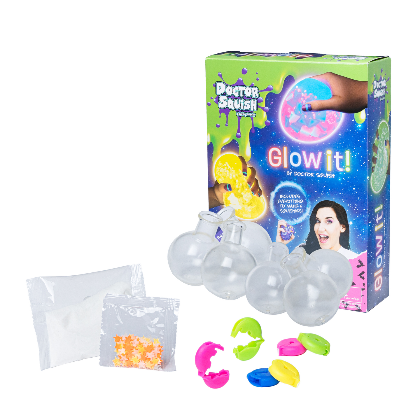 Doctor Squish GLOW IT Refill Pack – Enemmän hohtoa, enemmän hauskaa! Jatka luovaa seikkailua Doctor Squish GLOW IT Refill Pack -täyttöpaketin avulla! Luo entistä enemmän pimeässä hohtavia squishy-leluja tämän setin avulla, joka sisältää lisää materiaaleja DIY-squishy-luomustesi elävöittämiseen. Olipa kyseessä säihkyvät, hohtavat designit tai täysin uudet squishy-tyylit, tämä täyttöpaketti varmistaa, että hauskanpito ei koskaan lopu!