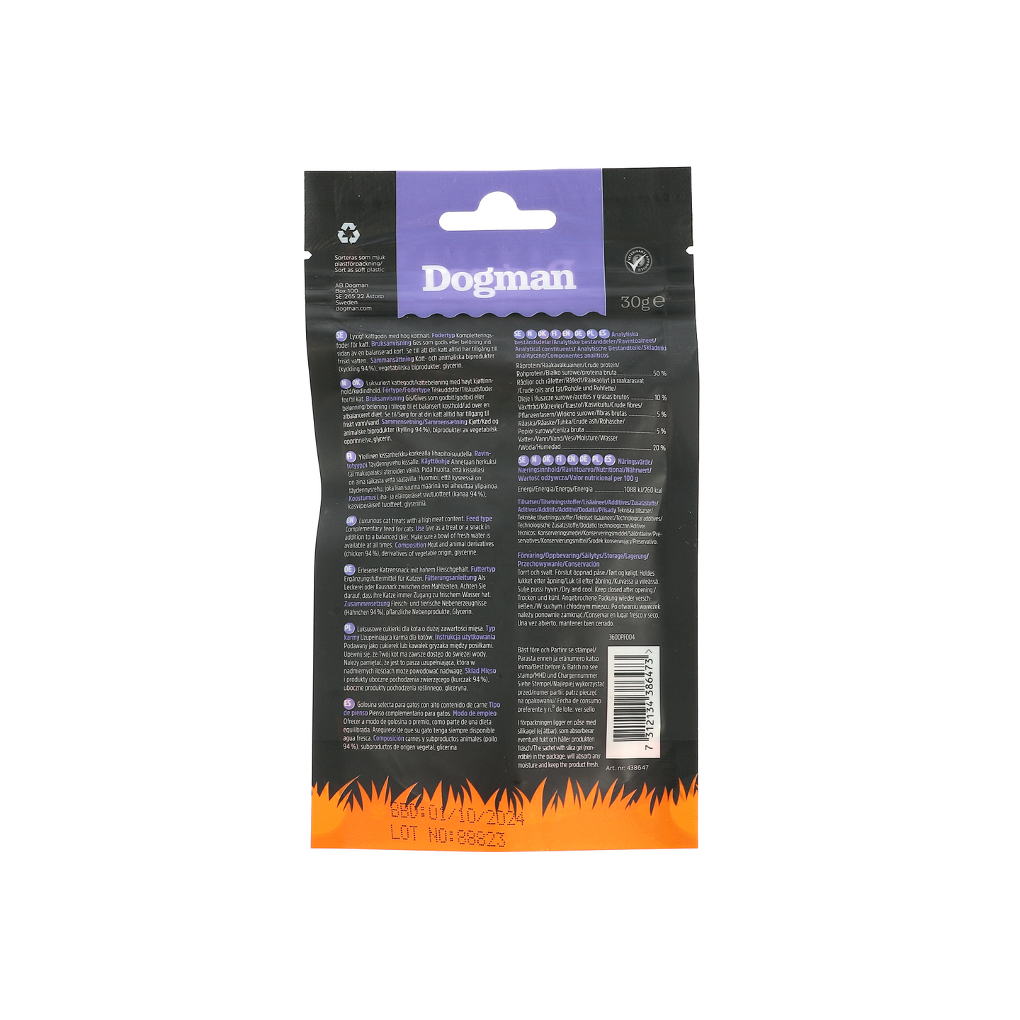 Ensiluokkainen, pehmeä kanaherkku, jossa on korkea pitoisuus kananlihaa (94 %). Täydellinen nirsoille kissoille! Herkut voidaan antaa kokonaisina tai jakaa pienempiin paloihin. Annetaan herkkupalana tasapainoisen ruokavalion lisäksi.