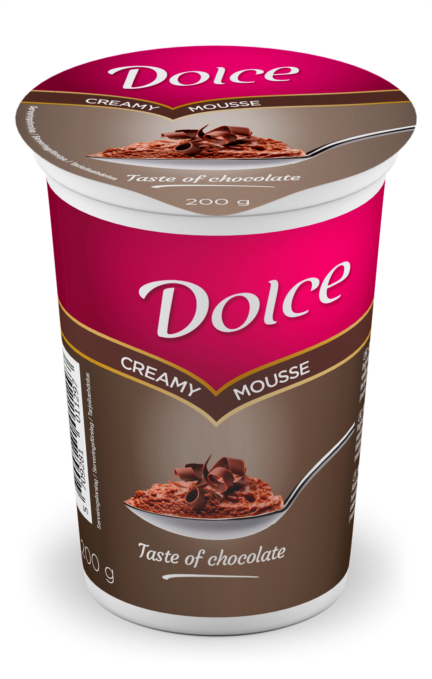 Dolce kermainen suklaanmakuinen mousse on tehty oikeaan kermaan (80%). Se on kuohkea, täyteläinen ja maultaan kermaisen pehmeä. Dolce mousse on aito makuelämys joka toimii hyvin jälkiruokana tai pieneen makean nälkään. Ei sisällä makeutusaineita tai kasvispohjaisia öljyjä kuten palmuöljyä.