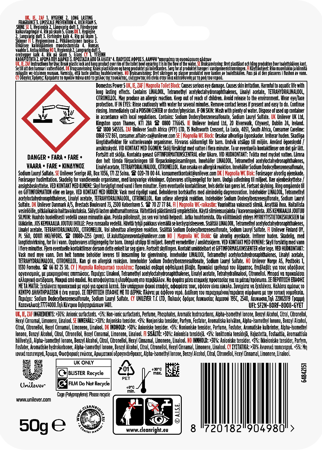 Raikasta jokainen huuhtelusi Domestos Power 5 Pink Magnolia WC-raikastimella! Paras WC-raikastimemme ei tarjoa vain yhtä, vaan jopa viisi erilaista ominaisuutta mahtavaan puhtauteen. Power 5 Pink Magnolia WC-raikastin tuo jokaisella huuhtelulla WC-pönttöösi runsaan vaahdon, kiiltävän puhtauden ja raikkaan pitkäkestoisen tuoksun. Se myös ehkäisee WC-pöntön likaantumista ja kalkkiintumista. Kokeile! Pidä WC-istuin raikkaana ja puhtaana. Se on helppoa Domestos Power 5 Pink Magnolia WC-raikastimen avulla. Taita ripustin ulos, riko muovitiiviste ja ripusta WC-raikastin WC-istuimen reunan yli niin, että raikastin osuu vesivirtaukseen aina kun vedät WC:n. Riippumatta siitä, käytätkö WC-raikastinta, WC-raikastintikkuja tai WC-siivousaineitamme, voit luottaa siihen, että me Domestoksella pidämme WC-istuimesi puhtaana, hygieenisenä ja raikkaana. Tuloksena on puhdas, hyväntuoksuinen ja hygieeninen vessa tai kylpyhuone. Domestos Power 5 Pink Magnolia suojaa sinua ja perhettäsi tehokkaasti bakteereilta. Käytä aina bakterisidisiä, desinfiointiaineita sisältäviä, puhdistusaineita turvallisesti ja kestävästi. Lue käyttöohje ja pakkausseloste ennen käyttöä. Domestos on tunnettu kodinpuhdistuksen brittiläinen tavaramerkki, joka on auttanut pitämään koteja puhtaana aina 1920-luvulta saakka. Taistelemme paremman hygienian puolesta kaikkialla maailmassa. Domestos osallistuu torjumaan bakteereja myös siellä, missä apua eniten tarvitaan. Yhteistyössä UNICEFin kanssa ja oman kehitysohjelmansa avulla Domestos lisää hygieniatietoisuutta ja auttaa parantamaan sanitaatiota mm. Intiassa ja Afrikan mantereen maissa. Viimeiset kymmenen vuotta olemme torjuneet huonoja saniteettiolosuhteita ja auttaneet 28 miljoonaa ihmistä saamaan puhtaamman ja turvallisemman WC:n. Nyt olemme asettaneet tavoitteemme uudelleen: 100 miljoonaan ihmiseen vuoteen 2030 mennessä. WC-tilojen lisääminen ei riitä. Olemassa olevat WC:t on pidettävä toimintakunnossa varmistamalla, että niitä käytetään, puhdistetaan ja huolletaan turvallisesti. Tämä tarkoittaa positiivisten tapojen luomista tämän sukupolven keskuudessa. Näin rakennetaan oikeanlainen hygieniaperusta tuleville sukupolville.