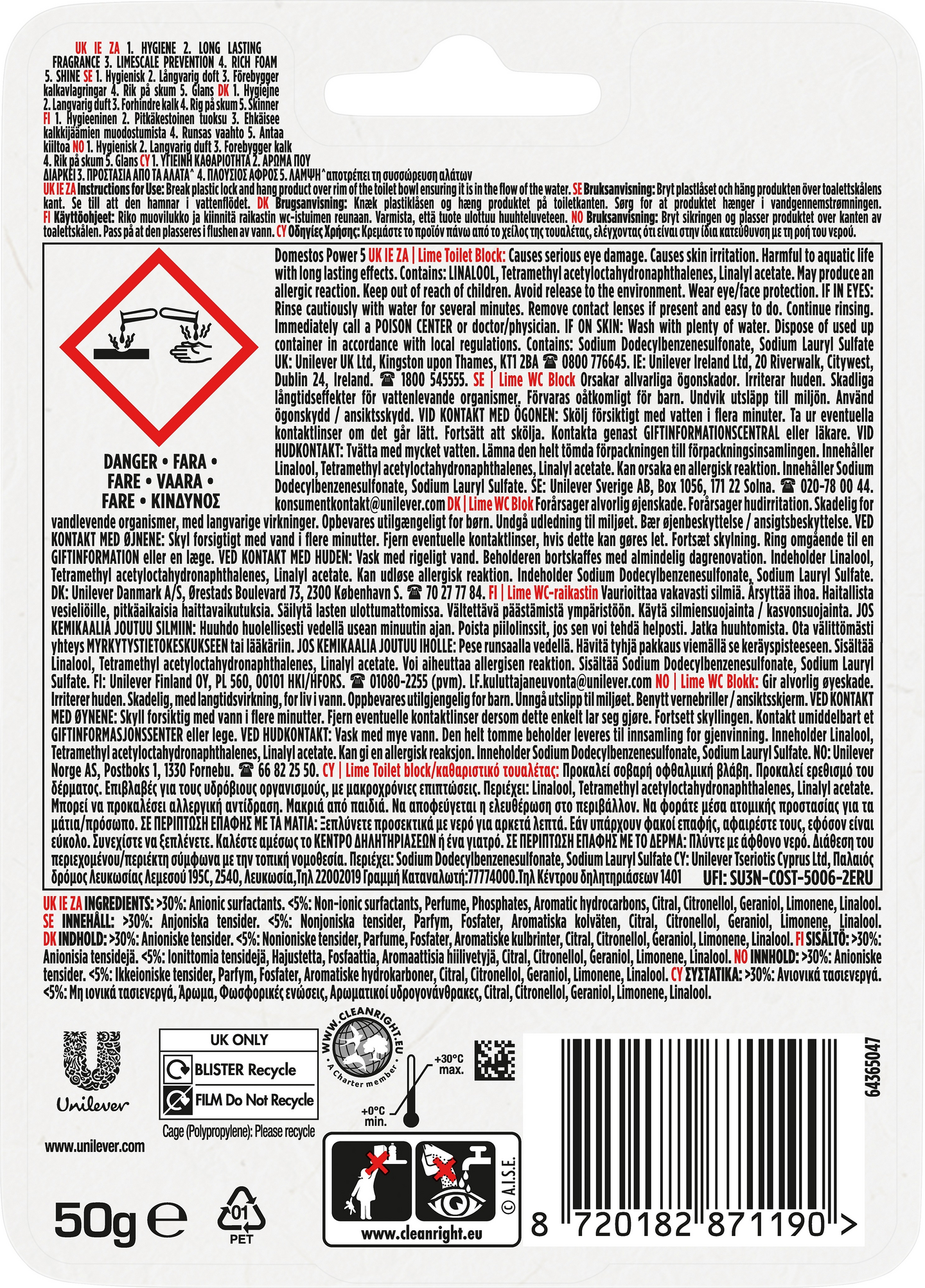 Raikasta jokainen huuhtelusi Domestos Power 5 Lime WC-raikastimella! Paras WC-raikastimemme ei tarjoa vain yhtä, vaan jopa viisi erilaista ominaisuutta mahtavaan puhtauteen. Power 5 Lime WC-raikastin tuo jokaisella huuhtelulla WC-pönttöösi runsaan vaahdon, kiiltävän puhtauden ja raikkaan pitkäkestoisen tuoksun. Se myös ehkäisee WC-pöntön likaantumista ja kalkkiintumista. Kokeile! Pidä WC-istuin raikkaana ja puhtaana. Se on helppoa Domestos Power 5 Lime WC-raikastimen avulla. Taita ripustin ulos, riko muovitiiviste ja ripusta WC-raikastin WC-istuimen reunan yli niin, että raikastin osuu vesivirtaukseen aina kun vedät WC:n. Riippumatta siitä, käytätkö WC-raikastinta, WC-raikastintikkuja tai WC-siivousaineitamme, voit luottaa siihen, että me Domestoksella pidämme WC-istuimesi puhtaana, hygieenisenä ja raikkaana. Tuloksena on puhdas, hyväntuoksuinen ja hygieeninen vessa tai kylpyhuone. Domestos Power 5 Lime suojaa sinua ja perhettäsi tehokkaasti bakteereilta. Käytä aina bakterisidisiä, desinfiointiaineita sisältäviä, puhdistusaineita turvallisesti ja kestävästi. Lue käyttöohje ja pakkausseloste ennen käyttöä. Domestos on tunnettu kodinpuhdistuksen brittiläinen tavaramerkki, joka on auttanut pitämään koteja puhtaana aina 1920-luvulta saakka. Taistelemme paremman hygienian puolesta kaikkialla maailmassa. Domestos osallistuu torjumaan bakteereja myös siellä, missä apua eniten tarvitaan. Yhteistyössä UNICEFin kanssa ja oman kehitysohjelmansa avulla Domestos lisää hygieniatietoisuutta ja auttaa parantamaan sanitaatiota mm. Intiassa ja Afrikan mantereen maissa. Viimeiset kymmenen vuotta olemme torjuneet huonoja saniteettiolosuhteita ja auttaneet 28 miljoonaa ihmistä saamaan puhtaamman ja turvallisemman WC:n. Nyt olemme asettaneet tavoitteemme uudelleen: 100 miljoonaan ihmiseen vuoteen 2030 mennessä. WC-tilojen lisääminen ei riitä. Olemassa olevat WC:t on pidettävä toimintakunnossa varmistamalla, että niitä käytetään, puhdistetaan ja huolletaan turvallisesti. Tämä tarkoittaa positiivisten tapojen luomista tämän sukupolven keskuudessa. Näin rakennetaan oikeanlainen hygieniaperusta tuleville sukupolville.