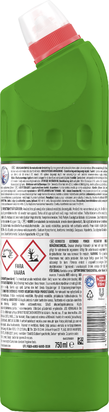 Domestos Mountain Fresh WC-puhdistusaine on tehokas valkaiseva ja desinfioiva puhdistustuote, joka puhdistaa WC-tilat ja viemärit, mutta myös muut pinnat, kuten ympäröivät lattiat. Se on puhdistusaine, joka antaa pitkäaikaisen suojan ja ehkäisee kalkin kertymistä. Puhdistusaineen koostumuksen molekyylit vaikuttavat myös vedenpinnan alapuolella WC-pöntössä. Ne poistavat tahroja ja estävät kalkkikerrostumia jopa kolme kertaa pidempään kuin ennen. Tuloksena puhdas, hyväntuoksuinen ja hygieeninen vessa. Domestos Mountain Fresh tappaa 99,9 % kaikista tunnetuista bakteereista ja viruksista pinnoilla, joilla käytät pesuainetta. WC:n puhdistusaine tarjoaa myös kestävän bakteerisuojan. Domestos Mountain Fresh WC:n puhdistusainetta voit käyttää myös muissa paikoissa kuin kylpyhuoneessa ja WC:ssä. Se on monipuolinen tuote, joka suojaa sinua ja muita perheenjäseniä bakteereilta tehokkaasti useilla eri pinnoilla. Muista vain noudattaa pullossa olevia ohjeita. Käytä bakterisidejä sisältäviä desinfiointiaineita aina turvallisesti ja kestävästi. Lue aina pakkauksessa olevat tiedot ennen käyttöä. Domestos on tunnettu kodinpuhdistuksen brittiläinen tavaramerkki, joka on auttanut pitämään koteja puhtaana aina 1920-luvulta saakka. Taistelemme paremman hygienian puolesta kaikkialla maailmassa. Domestos osallistuu torjumaan bakteerit myös siellä, missä apua eniten tarvitaan. Yhteistyössä UNICEFin kanssa ja oman kehitysohjelmansa avulla Domestos lisää hygieniatietoisuutta ja auttaa parantamaan sanitaatiota mm. Intiassa ja Afrikan mantereen maissa. Viimeiset kymmenen vuotta olemme torjuneet huonoja saniteettiolosuhteita ja auttaneet 28 miljoonaa ihmistä saamaan puhtaamman ja turvallisemman wc:n. Nyt olemme asettaneet tavoitteemme uudelleen: 100 miljoonaan ihmiseen vuoteen 2030 mennessä. WC-tilojen lisääminen ei riitä. Myös olemassa olevat WC:t on pidettävä toimintakunnossa ja varmistaa, että niitä käytetään ja huolletaan turvallisesti. Näin rakennetaan oikeanlainen hygieniaperusta tuleville sukupolville.