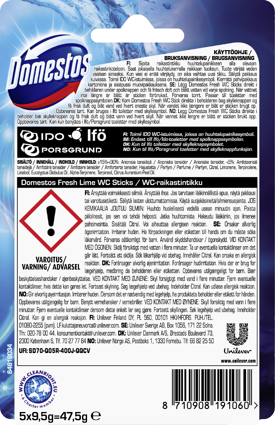 Domestos Fresh Lime WC-raikastintikut (5 kpl paketti) on WC:n puhdistusmenetelmä, joka pitää WC:si puhtaana sekä hygieenisenä ja saa kylpyhuoneesi tuoksumaan hyvältä. Domestos Fresh Lime WC-raikastintikut värjäävät huuhteluveden raikkaan vihreäksi. Nautit raikkaan limen tuoksusta jokaisella huuhtelulla. Tuote vähentää kalkinmuodostusta, saostumia ja epämiellyttäviä tuoksuja WC:ssä ja kylpyhuoneessa. Tuloksena puhdas, hygieeninen ja hyväntuoksuinen vessa. WC-raikastintikut ovat hygieenisiä käyttää. Aseta raikastintikku suoraan huuhtelupainikkeen alla olevaan raikastinkoteloon. Domestos WC-raikastintikut on tehty erityisesti huuhtelusymboleilla varustettuihin IDO WC-istuimiin. Domestos WC:n puhdistusaineet on suunniteltu pitämään WC:si ja kylpyhuoneesi puhtaana, hygieenisenä ja raikkaana. Domestos Vessanpuhdistus Fresh WC-raikastintikut suojaavat sinua ja perhettäsi tehokkaasti WC:ssä leviäviä bakteereja vastaan. Käytä bakteereja tuhoavia aineita aina harkiten ja vastuullisesti. Lue käyttöohje ja pakkausseloste ennen käyttöä. Domestos on tunnettu kodinpuhdistuksen brittiläinen tavaramerkki, joka on auttanut pitämään koteja puhtaana aina 1920-luvulta saakka. Taistelemme paremman hygienian puolesta kaikkialla maailmassa. Domestos osallistuu torjumaan bakteereita myös siellä, missä apua eniten tarvitaan. Yhteistyössä UNICEFin kanssa ja oman kehitysohjelmansa avulla Domestos lisää hygieniatietoisuutta ja auttaa parantamaan sanitaatiota mm. Intiassa ja Afrikan mantereen maissa. Viimeiset kymmenen vuotta olemme torjuneet huonoja saniteettiolosuhteita ja auttaneet 28 miljoonaa ihmistä saamaan puhtaamman ja turvallisemman WC:n. Nyt olemme asettaneet tavoitteemme uudelleen: 100 miljoonaan ihmiseen vuoteen 2030 mennessä. WC-tilojen lisääminen ei riitä. Olemassa olevat WC:t on pidettävä toimintakunnossa varmistamalla, että niitä käytetään, puhdistetaan ja huolletaan turvallisesti. Tämä tarkoittaa positiivisten tapojen luomista tämän sukupolven keskuudessa. Näin rakennetaan oikeanlainen hygieniaperusta tuleville sukupolville.