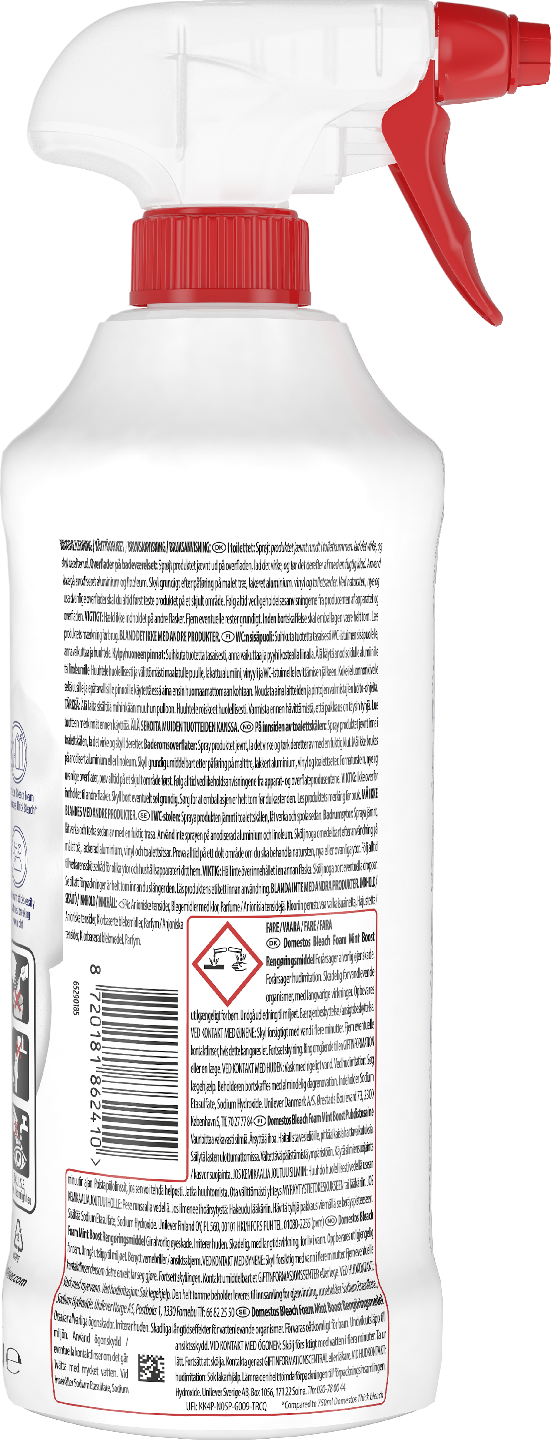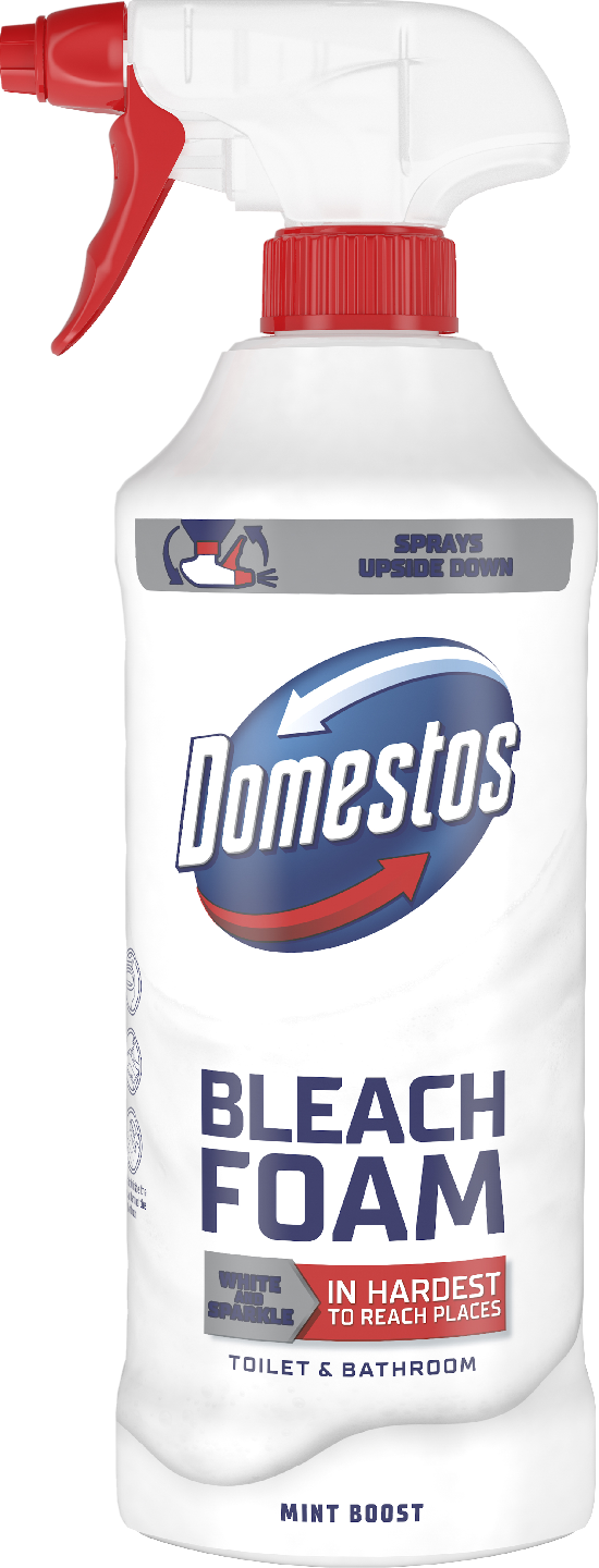 Onko sinulla vaikeuksia puhdistaa wc:n ja kylpyhuoneen vaikeapääsyisiä pintoja? Domestos Power Foam Mint Boost wc-puhdistussuihke on wc:n ja kylpyhuoneen puhdistussuihke, joka on suunniteltu suihkutettavaksi ylösalaisin. Näin sen käyttö on todella helppoa hankalissakin paikoissa. Raikkaalla mintuntuoksulla varustettu Domestos Power Foam Mint Boost WC-suihke tekee kylpyhuoneestasi hygieenisen raikkaan ja säihkyvän puhtaan jokaisella suihkauksella. Domestos Power Foam Floral Mint Boost. wc-puhdistussuihke on tehokas wc:n ja kylpyhuoneen puhdistus- ja desinfiointiaine ja se tappaa bakteereja jopa 99,99 prosenttisesti*. Sen kätevä suihkutusnokka ulottuu wc-istuimen reunan alapuolelle. Näin puhdistusvaahto pääsee tappamaan bakteerit myös vaikeapääsyisistä paikoista wc-istuimen sisä- ja ulkopuolelta. Domestos Power Foam Mint Boost wc-puhdistussuihke on tehokas ja monikäyttöinen puhdistus- ja desinfiointiaine ja sillä voi tehokkaasti puhdistaa myös erilaiset kylpyhuoneen pinnat, kuten kaakelit, lavuaarit, hanat, peilit ja suihkun. Puhdistuksen lopputuloksena on puhdas ja hyväntuoksuinen wc ja kylpyhuone. Käyttöohje: Suihkuta puhdistusainetta tasaisesti wc-istuimen sisäpuolelle, anna vaikuttaa ja huuhtele pois. Puhdista kylpyhuone seuraavasti: Suihkuta puhdistussuihke tasaisesti puhdistettavalla pinnalle, anna vaikuttaa ja pyyhi sitten kostealla liinalla. Täydellisen desinfioinnin aikaansaamiseksi anna tuotteen vaikuttaa vähintään 30 minuuttia. Käytä biosideja turvallisesti. Lue aina merkinnät ja valmistetiedot ennen käyttöä. *Eliminoi 99,99% bakteereista (testattu E. Coli, S. Aureus, E. Hirae, P. Aeruginosa, EN 1276- ja EN 13697-standardien mukaisesti) ja vaipallisista viruksista (testattu Vaccinia kannalla EN 14476-standardien ja EN 1677 mukaisesti) 30 minuutissa.