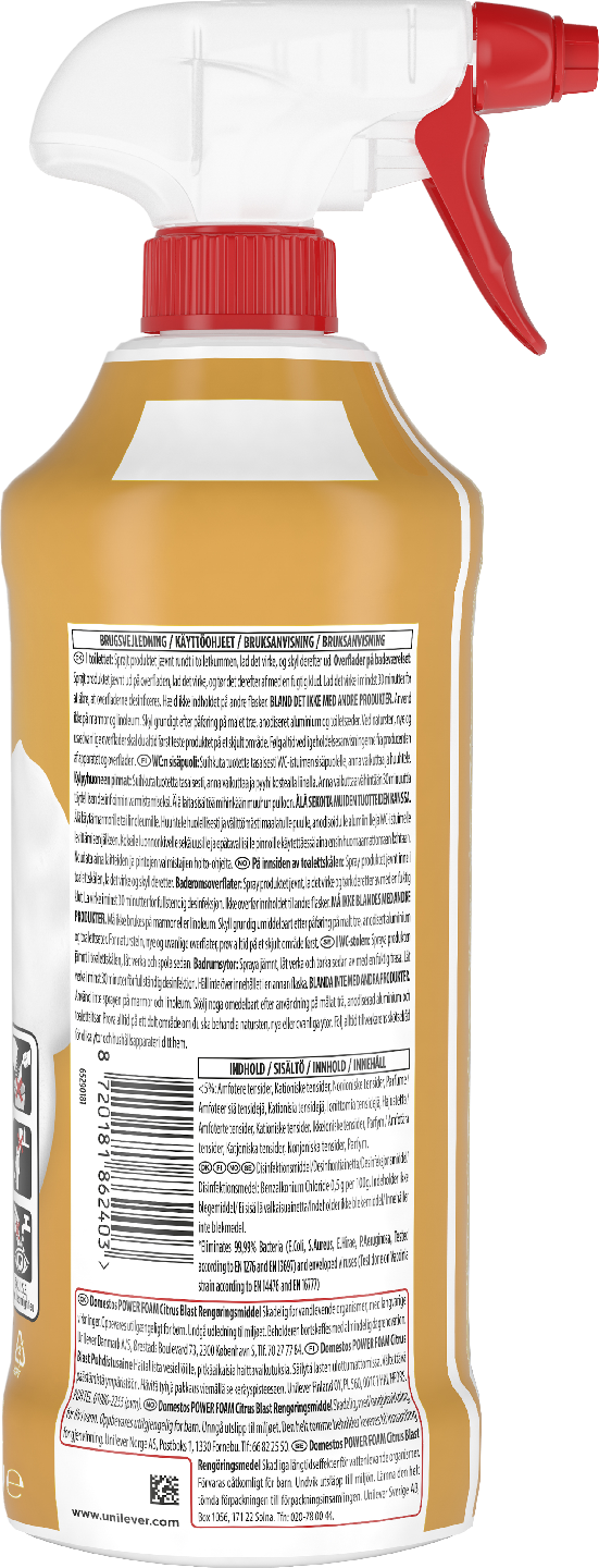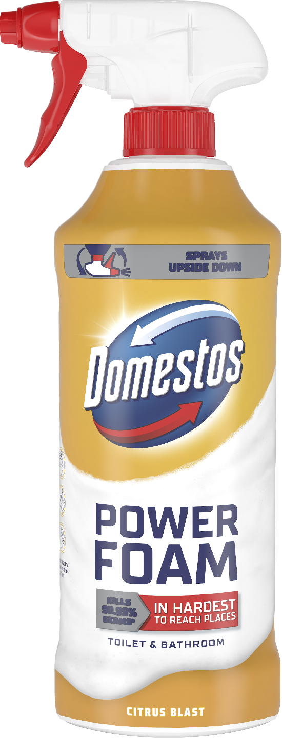 Onko sinulla vaikeuksia puhdistaa wc:n ja kylpyhuoneen vaikeapääsyisiä pintoja? Domestos Power Foam Citrus Blast wc-puhdistussuihke on wc:n ja kylpyhuoneen puhdistussuihke, joka on suunniteltu suihkutettavaksi ylösalaisin. Näin sen käyttö on todella helppoa hankalissakin paikoissa. Domestos Power Foam Citrus Blast wc-puhdistussuihke myös poistaa pahat hajut ja jättää raikkaan sitrustuoksun kylpyhuoneeseesi. Domestos Power Foam Citrus Blast wc-puhdistussuihke on tehokas wc:n ja kylpyhuoneen puhdistus- ja desinfiointiaine ja se tappaa bakteereja jopa 99,99 prosenttisesti*. Sen kätevä suihkutusnokka ulottuu wc-istuimen reunan alapuolelle. Näin puhdistusvaahto pääsee tappamaan bakteerit myös vaikeapääsyisistä paikoista wc-istuimen sisä- ja ulkopuolelta. Domestos Power Foam Citrus Blast wc-puhdistussuihke on tehokas ja monikäyttöinen puhdistus- ja desinfiointiaine ja sillä voi tehokkaasti puhdistaa myös erilaiset kylpyhuoneen pinnat, kuten kaakelit, lavuaarit, hanat, peilit ja suihkun. Puhdistuksen lopputuloksena on puhdas ja hyväntuoksuinen wc ja kylpyhuone. Käyttöohje: Suihkuta puhdistusainetta tasaisesti wc-istuimen sisäpuolelle, anna vaikuttaa ja huuhtele pois. Puhdista kylpyhuone seuraavasti: Suihkuta puhdistussuihke tasaisesti puhdistettavalla pinnalle, anna vaikuttaa ja pyyhi sitten kostealla liinalla. Täydellisen desinfioinnin aikaansaamiseksi anna tuotteen vaikuttaa vähintään 30 minuuttia. Käytä biosideja turvallisesti. Lue aina merkinnät ja valmistetiedot ennen käyttöä. *Eliminoi 99,99% bakteereista (testattu E. Coli, S. Aureus, E. Hirae, P. Aeruginosa, EN 1276- ja EN 13697-standardien mukaisesti) ja vaipallisista viruksista (testattu Vaccinia kannalla EN 14476-standardien ja EN 1677 mukaisesti) 30 minuutissa.
