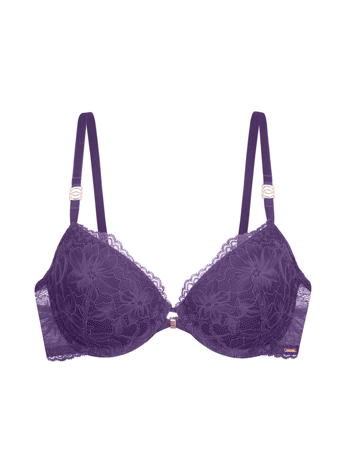 Kaarituelliset Dorina Jemma rintaliivit on kevyesti topatut. Ne ovat pitsiä ja niissä on kullanvärisiä metalliyksityiskohtia. Lila. Yhdistä Jemma alushousuihin.