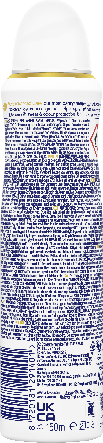 Tiesitkö, että jos ajelet kainalosi, 1/3 siitä mitä poistat on ihoa? Uusi Dove Advanced Care -antiperspirantti, jossa on Pro-ceramide-teknologia, auttaa ihoasi palautumaan jokaisen käyttökerran jälkeen ja tehostaa ihosi luonnollista uusiutumisprosessia, saadaksesi kainaloistasi pehmeämmät ja karvojen ajelua paremmin kestävät 72 tunnin suojalla. Kainaloiden hoitaminen on tärkeä osa mitä tahansa ihonhoitorutiinia. Dove 72h Advanced Care Go Fresh Açaí & Water Lily antiperspirantti deodorantti spray antaa ihollesi sen ansaitsemaa hoitoa ja voit tuntea olosi raikkaaksi, sillä se antaa 72 tunnin suojan hajuja ja hikeä vastaan. Raikkaan hedelmäinen Dove 72h Advanced Care Acai & Water Lily -suihke tuoksuu acai-marjoilta ja lumpeelta. Ihana tuoksu saa sinut tuntemaan itsesi energiseksi ja itsevarmaksi kaikissa tilanteissa. Dove 72h Advanced Care Acai & Water Lily antiperspirantti deodorantti spray yhdistää hellävaraisen kainaloiden hoidon pitkäaikaiseen, 72 tunnin hikoilusuojaan. Alkoholittoman antiperspirantin koostumuksessa on mukana Dove kosteusvoidetta, minkä ansiosta kainalosi tuntuvat ihanan pehmeiltä ja sileiltä. Dove 72h Advanced Care Acai & Water Lily antiperspirantti deodorantti spray sisältää pro-ceramide-teknologiaa, joka auttaa ihosi omaa korjausjärjestelmää ja vähentää ärsytystä karvan ajon jälkeen. Paljasta rohkeasti kainalosi. Tämä deodorantti tarjoaa sinulle raikkautta pitkäksi aikaa hajuja torjuvan teknologiansa ansiosta. Antiperspirantin puhdas tuoksu auttaa sinua aloittamaan päiväsi aina yhtä luottavaisena. Saat eniten irti 72 tunnin antiperspirantista, kun suihkutat tätä alkoholitonta antiperspiranttideodoranttia tasaisesti kumpaankin kainaloon. Suihkuta tarpeen mukaan lisää päivän aikana. Saat parhaan deodoranttisuojan, kun varmistat, että kainalot ovat puhtaat ja kuivat ennen suihketta. Dove 72h Advanced Care Acai & Water Lily antiperspirantti sopii täydellisesti juuri sinulle, joka haluat olla varma siitä, että tunnet olosi pirteäksi ja varmaksi tunnista toiseen. Hyvä idea on säilyttää deodoranttia kodin kylpyhuoneen lisäksi esimerkiksi työpaikalla työpöydän laatikossa. Laita myös yksi Doven suihke mukaan kuntosalilaukkuusi. Dove antiperspirantti deodorantti suihke suojaa parhaalla tavalla hikoilulta sekä torjuu pahoja hajuja ja epämiellyttäviä tuoksuja. Dove on PETA Vegan -sertifioitu.