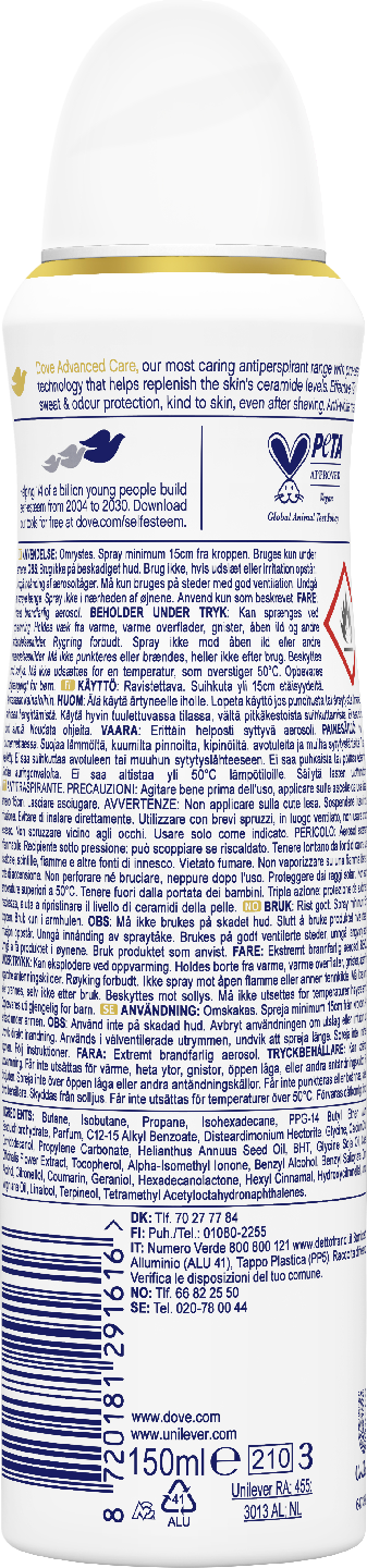Oletko joskus jättänyt pikkumustan kaappiin deodoranttiläiskien pelossa? Tässä on uusin asusteesi: Dove 72h Adanced Care Invisible Dry antiperspirantti deodorantti spray. Se ei jätä vaatteisiin valkoisia tahroja, mikä on tutkittu 100 värillä. Vaatekaapistasi tuli juuri värikkäämpi. Muiden Doven antiperspiranttien tapaan se antaa pitkäkestoista suojaa hikoilua ja hajuja vastaan – sinun ei tarvitse huolehtia märistä läiskistä kainaloissa. Pelkästään vaatteesi eivät hyödy Doven miedosta suihkeesta. Dove 72h Advanced Care Invisible Dry antiperspirantti deodoranttispray on täysin alkoholiton ja sen koostumuksessa on kosteusvoidetta sekä pro-ceramide-teknologia, joka säilyttää kosteuden syvällä ihossasi ja korjaa ärtynyttä ihoa ajelun jälkeen. Tiesitkö, että jos ajelet kainalosi, 1/3 siitä mitä poistat on ihoa? Pro-ceramide-teknologia, auttaa ihoasi palautumaan jokaisen käyttökerran jälkeen ja tehostaa ihosi luonnollista uusiutumisprosessia, saadaksesi kainaloistasi pehmeämmät ja karvojen ajelua paremmin kestävät 72 tunnin suojalla. Ihosi pysyy pehmeänä ja sileänä kosketukselle. Tämä Doven antiperspirantti tarjoaa helpotusta kainaloille, koska se auttaa vähentämään kainalokarvojen ajamisen aiheuttamaa ihoärsytystä. Paljasta rohkeasti kainalosi. Tämä deodorantti on suihke, joka tarjoaa sinulle raikkautta pitkäksi aikaa hajuja torjuvan teknologiansa ansiosta: 72 tunnin ajan. Antiperspirantin puhdas tuoksu auttaa sinua aloittamaan päiväsi aina yhtä luottavaisena. Saat eniten irti 72 tunnin antiperspirantista, kun suihkutat tätä alkoholitonta antiperspiranttideodoranttia tasaisesti kumpaankin kainaloon. Suihkuta tarpeen mukaan lisää päivän aikana. Saat parhaan deodoranttisuojan, kun varmistat, että kainalot ovat puhtaat ja kuivat ennen suihketta. Dove 72h Advanced Care Invisible Dry antiperspirantti sopii täydellisesti juuri sinulle, joka haluat olla varma siitä, että tunnet olosi pirteäksi ja varmaksi tunnista toiseen. Hyvä idea on säilyttää deodoranttia kodin kylpyhuoneen lisäksi esimerkiksi työpaikalla työpöydän laatikossa. Laita myös yksi Dove suihkedeodorantti mukaan kuntosalilaukkuusi. Dove antiperspirantti deodorantti suihke suojaa parhaalla tavalla hikoilulta sekä torjuu pahoja hajuja ja epämiellyttäviä tuoksuja. Dove on PETA Vegan -sertifioitu.