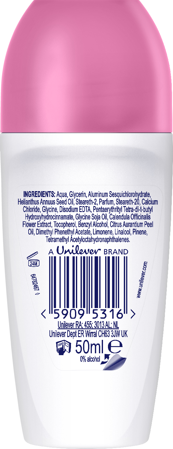 Kestävä antiperspiranttisuoja, annos miellyttävää ihonhoitoa ja raikas granaattiomenan tuoksu – kuka sanoi, ettei niitä kaikkea voi saada kerralla? Kokeile Dove 72h Advanced Care Pomegranate antiperspirantti deodorantti roll-onia. Koe sen raikastava vaikutus heti ensimmäisenä aamulla. Hedelmäisen granaattiomenan tuoksun ansiosta tunnet itsesi varmaksi ja tuoksut upealta koko päivän. Kun tarvitset suojaa hikoilua ja pahaa hajua vastaan, ota käteesi Dove 72h Advanced Care Pomegranate antiperspirantti deodorantti roll-on. Tuotteen sisältämä ainutlaatuisen edistyksellinen ja ihoystävällinen koostumus antaa paitsi tehokkaan suojan hikoilulta, se myös hoitaa ihoasi. Siinä on mukana kosteusvoide. Samalla kun se on hellävarainen iholle, se pitää pahat hajut ja hien loitolla jopa 72 tunnin ajan. Tämä antiperspirantti deodorantti auttaa lievittämään kainaloiden ärsytystä ja pitää kainalot suojattuina ja hoidettuina kaikissa tilanteissa uskomattoman pitkään. Roll-on sisältää 0 % alkoholia joten se ei ärsytä ihoa. Mukana kosteusvoide ja Triple Moisturizing -teknologia, jonka ansiosta roll-on on paitsi hikoilulta suojaava, myös erittäin hoitava. Tuotteen sisältämät kosteusvoiteet tehostavat ihosi omaa suojaa ja auttavat säilyttämään sen luontaisen kosteuden pintaa syvemmällä. Se auttaa tekemään kainaloista pehmeät ja sileät. Levitä tätä alkoholitonta antiperspiranttideodoranttia tasaisesti kumpaankin kainaloon. Levitä tarpeen mukaan lisää päivän aikana. Saat parhaan suojan hikeä ja hajuja vastaan, kun varmistat, että kainalot ovat puhtaat ja kuivat ennen antiperspirantin levittämistä. Dove on PETA Vegan -sertifioitu.