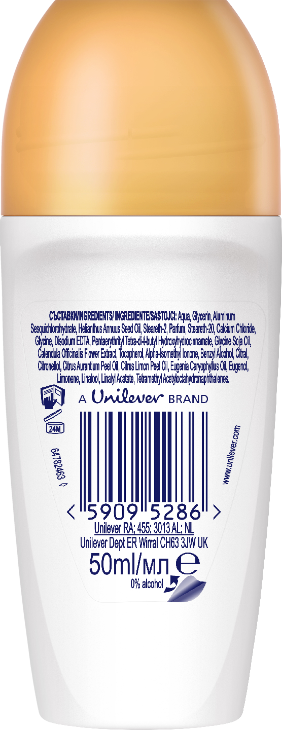 Nauti suihkun jälkeisestä raikkaasta tunteesta yhtä raikkaalla deodorantilla. Dove 72h Advanced Care Passion Fruit & Lemongrass antiperspirantti deodorantti roll-on on luotettava deodorantti naisille. Se tarjoaa tehokkaan suojan hikeä ja pahaa hajua vastaan jopa 72 tunnin ajan. Nauti puhtaasta ja super raikkaasta tuoksusta, jossa on vivahteita passiohedelmästä ja sitruunaruohosta. Dove 72h Advanced Care Passion Fruit & Lemongrass antiperspirantti deodorantti roll-on yhdistää hellävaraisen kainaloiden hoidon pitkäaikaiseen, 72 tunnin hikoilusuojaan. Alkoholittoman antiperspirantin koostumuksessa on mukana Doven kosteusvoide ja Triple Moisturizing -teknologia, minkä ansiosta kainalosi tuntuvat ihanan pehmeiltä ja sileiltä. Paljasta rohkeasti kainalosi. Dove deodorantti tarjoaa sinulle raikkautta pitkäksi aikaa hajuja torjuvan teknologiansa ansiosta. Antiperspirantin puhdas tuoksu auttaa sinua aloittamaan päiväsi aina yhtä luottavaisena. Saat eniten irti 72 tunnin antiperspirantista, kun levität tätä alkoholitonta antiperspiranttideodoranttia tasaisesti kumpaankin kainaloon. Levitä tarpeen mukaan lisää päivän aikana. Saat parhaan deodoranttisuojan, kun varmistat, että kainalot ovat puhtaat ja kuivat ennen levittämistä. Dove 72h Advanced Care Passion Fruit & Lemongrass antiperspirantti sopii täydellisesti juuri sinulle, joka haluat olla varma siitä, että tunnet olosi pirteäksi ja varmaksi tunnista toiseen. Hyvä idea on säilyttää deodoranttia kodin kylpyhuoneen lisäksi esimerkiksi työpaikalla työpöydän laatikossa. Laita myös yksi Dove roll-on mukaan kuntosalilaukkuusi. Dove antiperspirantti deodorantti roll-on suojaa parhaalla tavalla hikoilulta sekä torjuu pahoja hajuja ja epämiellyttäviä tuoksuja. Dove on PETA Vegan -sertifioitu.