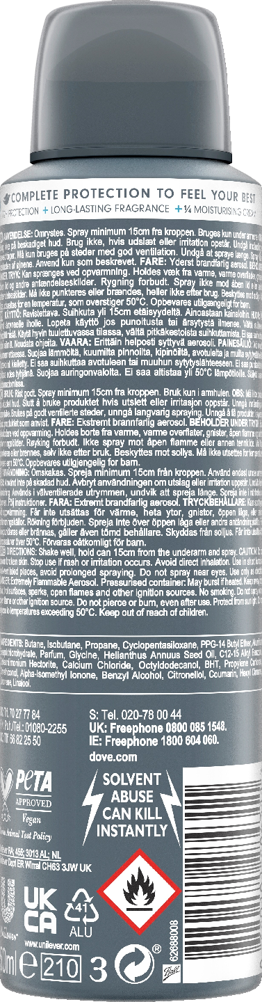 Kun etsit pitkäkestoista miehille tarkoitettua deodoranttia, joka suojaa tehokkaasti hikoilulta, kokeile Dove Men+Care 72h Advanced Clean Comfort antiperspirantti deodoranttia. Tämä deodorantti spray on erityisesti miehille suunniteltu antiperspiranttisuihke. Suihke sisältää nyt ainutlaatuisen Triple Action -teknologian, joka tarjoaa 72 tunnin tehokkaan suojan hikoilua ja pahoja hajuja vastaan. Näin Dove deodorantti auttaa sinua pysymään raikkaana ja kuivana riippumatta siitä, mitä tulee tiellesi. Sen koostumuksessa on mukana kosteusvoide, joka vahvistaa ihoasi. Kainalot tuntuvat miellyttäviltä koko päivän. Dove Men+Care tuo hoitavan antiperspiranttisuihkeen modernin miehen elämän keskipisteeseen. Tämä spray auttaa sinua huolehtimaan itsestäsi, jotta voit keskittyä täydellä energialla sinulle tärkeisiin asioihin ja ihmisiin. Dove Men+Care 72h Advanced Clean Comfort antiperspirantti on ankara hielle, mutta hellävarainen iholle. Se jättää ihollesi hienovaraisen tuoksun, joka pitää sinut raikkaana tuoksuisena pidempään. Kun sinulla on käytössäsi paras mahdollinen suoja hikeä ja hienhajua vstaa, olosi on itsevarma ja luottavainen. Ne ovat ominaisuuksia joita varmasti arvostat, kun haluat olla parhaimmillasi koko päivän. Käyttö: Ravista ensin Dove Men+Care 72h Advanced Clean Comfort antiperspiranttipurkkia hyvin. Pidä sitä sitten 15 senttimetrin päässä kainalosta ja suihkuta tasaisesti hyvin ilmastoidussa tilassa. Vältä suihkeen kosketusta silmien ja rikkoutuneen ihon kanssa. Mikset kokeilisi sitä yhdessä Dove Men+Care -vartalo- ja kasvopesuaineemme, suihkusaippuan kanssa. Näin tunnet olosi vielä raikkaammaksi ja varmemmaksi. Dove Men+Care Clean Comfort antiperspiranttia on saatavana myös 150 ml:n suihketölkkeinä sekä deodoranttipuikolla tai roll-onina – täydellinen varuste treenikassiin tai matkalaukkuun, kun ole harrastuksissa tai muuten vaan liikkeellä.