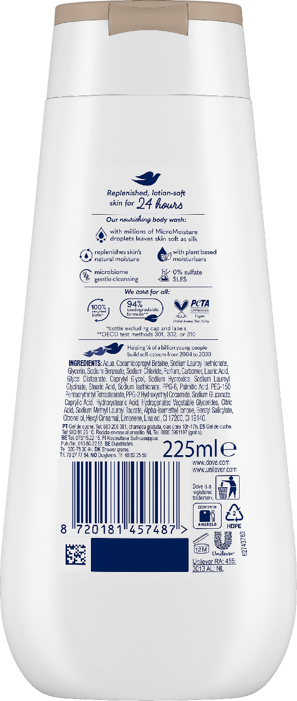 Dove Advanced Care Nourishing Silk -suihkusaippua tekee kuivastakin ihosta silkkisen pehmeän. Aivan kuten jokainen iho on erilainen, myös ihon kuivuus voi näkyä eri tavoin. Onpa ihosi ajoittain tai jatkuvasti kuiva, Dove Advanced Care Nourishing Silk -suihkusaippua auttaa. Se puhdistaa hellävaraisesti ja jättää iholle kosteutetun tunteen kuin kosteusvoide 24 tunnin ajaksi. Toisin kuin tavalliset suihkusaippuat, Dove Advanced Care sisältää 24h Renewing MicroMoisture -pisaroita. Kyseessä on Doven uraauurtava uusi teknologia. Siinä miljoonat pienet, tehokkaasti kosteuttavat pisarat eivät peseydy iholta pois, vaan imeytyvät syvälle ihoon. Ne tukevat ihon luonnollista uudistumisprosessia ja auttavat ihoa säilyttämään kosteuden myös suihkun jälkeen. Dove suihkusaippuan ansiosta jokainen suihku on ihana hemmottelutuokio. Runsaan täyteläinen vaahto tuntuu miellyttävältä ja tekee ihosta pehmeän kuin silkki. Suihkusaippua jättää iholle ihanan silkkisen tunteen 24 tunnin ajaksi. Dermatologisesti testattu suihkusaippua puhdistaa ja kosteuttaa ihoa luonnollisesti. Sen sulfaatiton koostumus sisältää luonnollisia mietoja puhdistusaineita ja ihoa ravitsevia ainesosia. Se ei sisällä SLES-sulfaatteja, vaan se on hellävarainen mikrobiomille – ihon elävälle suojakerrokselle. Doven visiona on maailma, jossa kauneus herättää itseluottamusta eikä ahdistusta. Siksi Dove on ottanut tehtäväkseen auttaa seuraavaa sukupolvea luomaan myönteisen suhteen omaan ulkonäköönsä. Lisäksi Dove on sitoutunut vähentämään muovijätettä ja se pyrkiikin osaltaan puuttumaan maailmanlaajuiseen kauneudenhoitoalan muovijäteongelmaan. Dove Advanced Care Nourishing Silk -suihkusaippuan koostumus on 94-prosenttisesti biohajoava*. Pullo on kokonaan kierrätettävä ja valmistettu täysin kierrätysmuovista**. Lisäksi Doven tuotteita ei testata koskaan eläimillä missään päin maailmaa. Yritys on saanut PETA Vegan Cruelty Free -sertifioinnin. *OECD-testimenetelmät 301, 302 tai 310 **korkki ja etiketti pois lukien