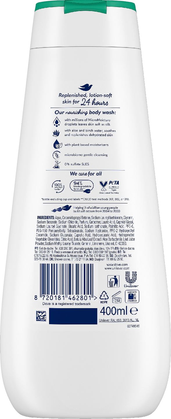 Dove Advanced Care Hydrating Care -suihkusaippua virkistää aisteja ja kosteuttaa ihoa. Suihkusaippuan sisältämä aloe vera ja koivuvesi auttavat elvyttämään ihoa jo yhden suihkukerran jälkeen. Mikä olisikaan parempi tapa herättää ihosi kuin hemmotteleva suihku, jonka jälkeen ihosi on ihanasti kosteutettu ja pehmeä kuin silkki. Toisin kuin tavalliset suihkusaippuat, Dove Advanced Care sisältää 24h Renewing MicroMoisture -pisaroita. Kyseessä on Doven uraauurtava uusi teknologia. Siinä miljoonat pienet, tehokkaasti kosteuttavat pisarat eivät peseydy iholta pois, vaan imeytyvät syvälle ihoon. Ne tukevat ihon luonnollista uudistumisprosessia ja auttavat ihoa säilyttämään kosteuden myös suihkun jälkeen. Dove Advanced Care Hydrating Care -suihkusaippua ei vain elvytä ihoa – se piristää ja virkistää aistejasi. Kevyesti vaahtoava ja syvästi kosteuttava suihkusaippua puhdistaa hellävaraisesti. Se jättää iholle raikkaan aloe veran ja koivuveden tuoksun ja tekee ihosta samaan tapaan ihanasti kosteutetun ja pehmeän kuin kosteusvoide. Dermatologisesti testattu suihkusaippua puhdistaa ja kosteuttaa ihoa luonnollisesti. Sen sulfaatiton koostumus sisältää luonnollisia mietoja puhdistusaineita ja ihoa ravitsevia ainesosia. Se ei sisällä SLES-sulfaatteja, vaan se on hellävarainen mikrobiomille – ihon elävälle suojakerrokselle. Doven visiona on maailma, jossa kauneus herättää itseluottamusta eikä ahdistusta. Siksi Dove on ottanut tehtäväkseen auttaa seuraavaa sukupolvea luomaan myönteisen suhteen omaan ulkonäköönsä. Lisäksi Dove on sitoutunut vähentämään muovijätettä ja se pyrkiikin osaltaan puuttumaan maailmanlaajuiseen kauneudenhoitoalan muovijäteongelmaan. Dove Advanced Care Hydrating Care -suihkusaippuan koostumus on 94-prosenttisesti biohajoava*. Pullo on kokonaan kierrätettävä ja valmistettu täysin kierrätysmuovista**. Lisäksi Doven tuotteita ei testata koskaan eläimillä missään päin maailmaa. Yritys on saanut PETA Vegan Cruelty Free -sertifioinnin. *OECD-testimenetelmät 301, 302 tai 310 **korkki ja etiketti pois lukien